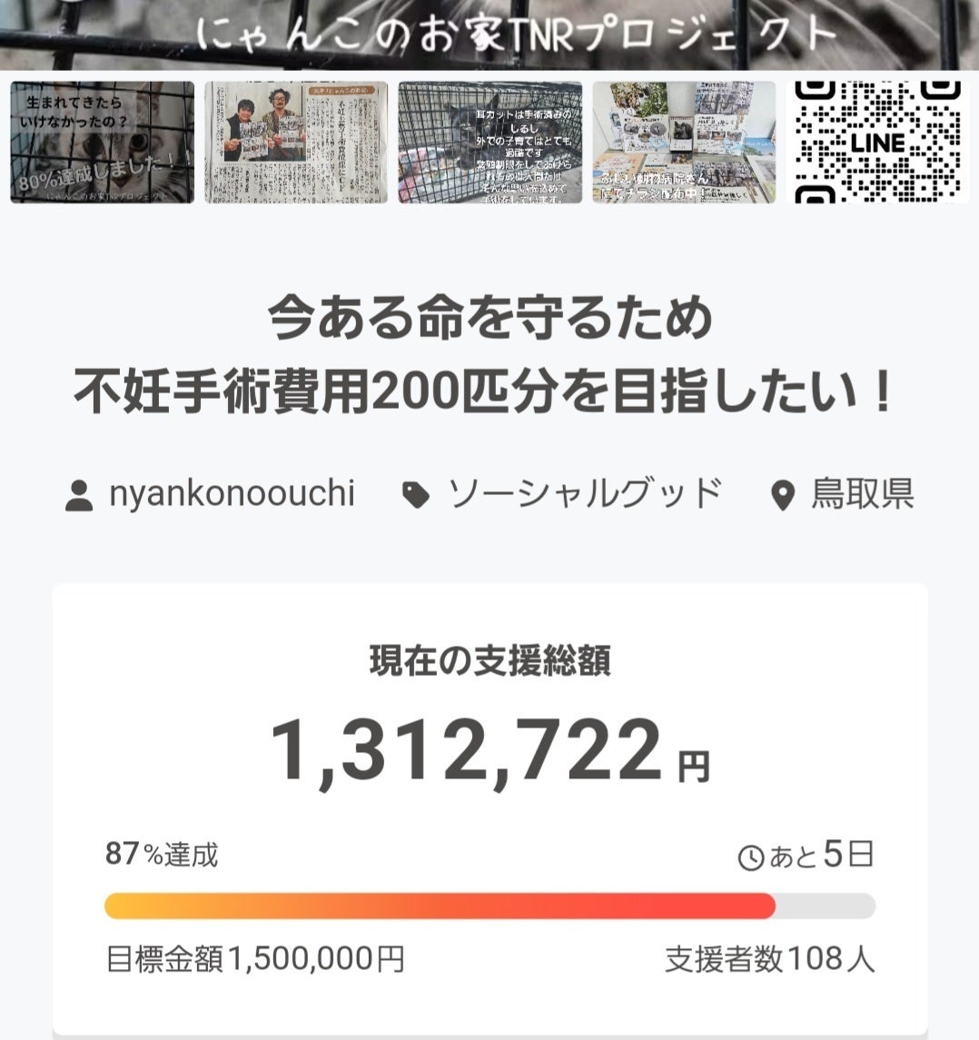 野良猫の不妊手術費用198匹分となり、あと2匹で最初の目標200匹分となります!最終目標は150万円の227匹分です!