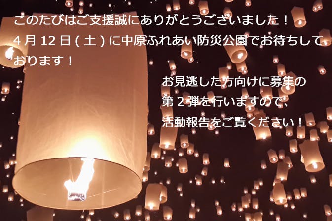 2025/03/01 09:04ランタン上げ参加のお申込みをいただいた皆さま、誠にありがとうございました!4月12日(土)は中原ふれあい防災公園でお待ちしております!(参加のご案内は後日あらためてメールにてお送りさせていただきます。)お見逃した方や3月以降に知ったという方向けに募集の第2弾も行いますので、まだお申込みされていない方はリンク先をご覧ください。https://camp-fire.jp/projects/833251/view もっと見る