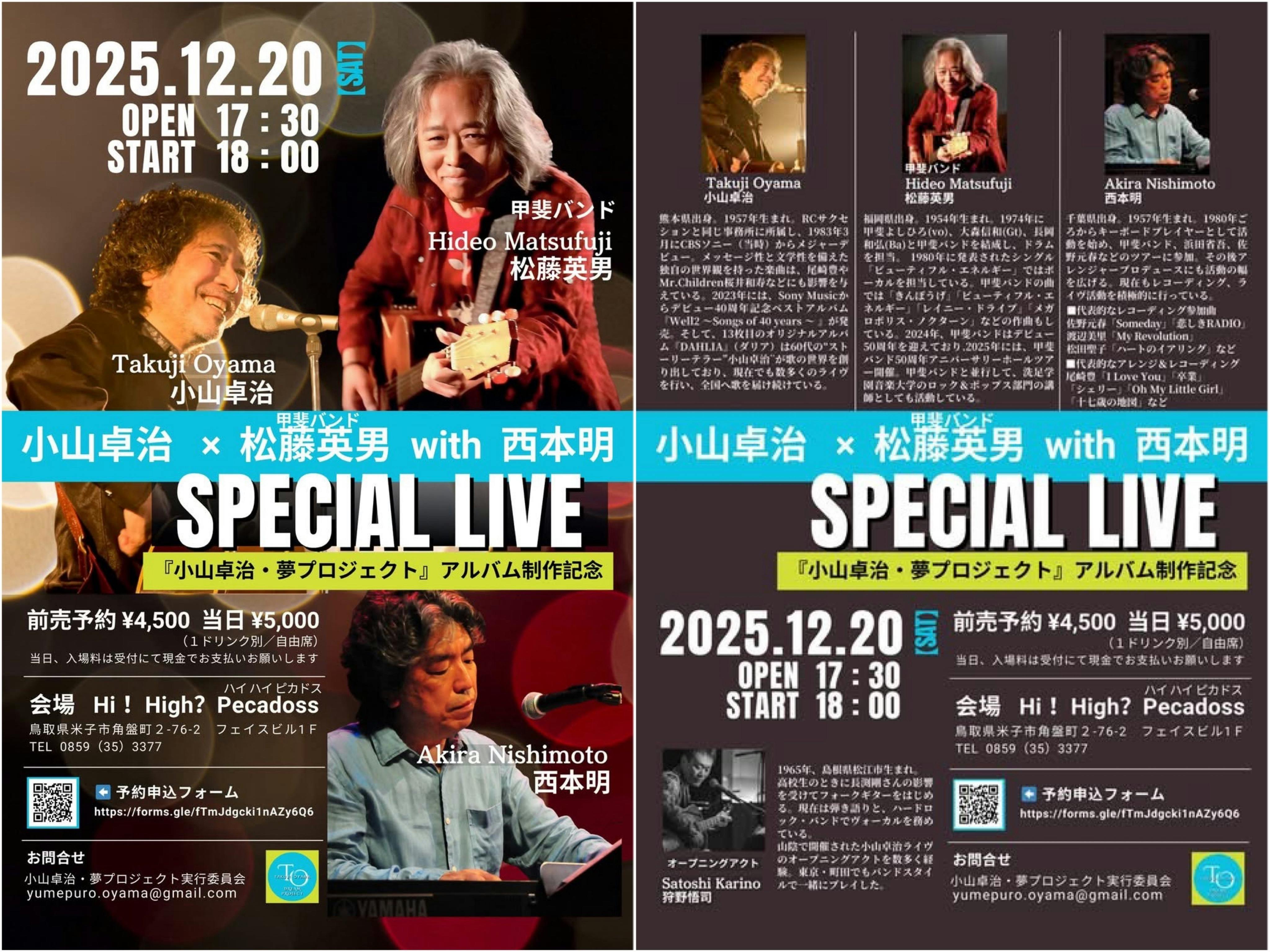2025/12/13 12:00来週に迫ってきました!!!12月20日(土)鳥取県米子小山卓治・夢プロジェクトアルバム制作記念『小山卓治×松藤英男 with 西本明』SPECIAL LIVE!!!当日のLIVE開催にあたって、小山卓治をデビューの頃から取材してきた音楽雑誌編集者&長年の友人、そして現在は出版プロデューサーである渡辺末美(すえみ)さんに協力していただいています。末美さんからのメッセージを紹介させていただきます。・・・・・・・・・・・・・・・・・・1982年に音楽専科社という出版社に入社し、「ARENA37℃(アリーナ・サーティーセブン)」の創刊2号目から編集を担当しました。入社3日目にして、シナロケのインタビューが実現。取材時間30分でスタッフが切ろうとしたところを、シーナさんと鮎川誠さんが遮ってくれ、2時間のロングインタビュー。そこから波に乗ってという表現はオーバーかもしれませんが、ロングインタビューを得意とするようになったのは事実。翌1983年、小山卓治さんがデビュー。小山卓治さんは当時、RCサクセションがいた事務所にスカウトされ、デビューのときからインタビューなどで付き合いがあり、異常に盛り上がるライヴ・パフォーマンスとは裏腹に、インタビューではシャイな印象が強く、ときに過激ともとれる詩を書き、物語作家としての評価が高いシンガソングライター。年齢が重なってくると、同時に、大きな愛に包まれた作品も増えてきました。ぼくは、小山卓治さんが表現された、たくさんの素晴らしい作品とともに、一緒に年齢を重ねてきました。もちろん、これからも。松藤英男さん。言わずと知れた甲斐バンドのドラマーであり、ヴォーカルであり、作曲家でもあります。小山卓治さんがデビューした1983年。甲斐バンドは現在都庁が建っている場所で、「THE BIG GIG」という、伝説的な野外イベントを開催。ぼくはアリーナで、このイベントを20ページに及ぶ特集を組んで大々的に伝えました。その前あたりからだったでしょうか。甲斐バンドを担当し、松藤さんも含め、何度も取材させていただいたのは。そもそも、甲斐バンドは中学生のときからファンで、かなり聴き込んでいましたから、取材は緊張感もありつつ、毎回とても楽しかったです。西本明さんは、浜田省吾さん、佐野元春さん、甲斐バンド、尾崎豊さん、白井貴子さん、沢田研二さん等々、数多くのステージやアレンジ、レコーディングに参加してきた、キーボーディスト、アレンジャー。そして卓越したプロデューサーです。浜田省吾さんは、まだ町支寛二さんと二人だけで、全国をツアーしていた頃から観ていましたし、アルバム「J.BOY」発売30周年記念としてリリースされた、スペシャルBOXに、J.BOYリリース当時に、ぼくが書いた原稿を入れていただいたり、佐野元春さんからは、インタビュー記事に喜んでいただき、直筆でお礼の手紙をいただいたり、(現在はどこにあるか不明)、なにかと縁があったみなさんと濃い仕事を続けていたのが西本明さんです。そんな松藤英男さんと西本明さんが、小山卓治さんの新作レコーディングに参加したのを機に、この度、鳥取県米子市でイベントを開催することになりました。桜井さんや尾崎さんが影響を受けたと公言した小山卓治さんと、松藤英男さん。そして、西本明さん。このようなチャンスは2度とないかもしれません。あなたも、極めて貴重なイベントの目撃者になってください。・・・・・・・・・・・・・・・・『小山卓治・夢プロジェクト』アルバム制作記念小山卓治 × 松藤英男《甲斐バンド》with 西本明 SPECIAL LIVE◉開催日: 2025年 12月20日(土) 開場:17時30分 開演:18時00分◉会場:Hi !High?Pecadoss (ハイハイ ピカドス) 鳥取県米子市角盤町2-76-2 TEL:0859-35-3377◉料金:前売予約 4,500円 当日 5,000円 (1ドリンク別/自由席)◉ OA:狩野悟司〈Satoshi Karino〉◉ お問合せ:小山卓治・夢プロジェクト実行委員会yumepuro.oyama@gmail.com↓↓↓予約申込はコチラからhttps://forms.gle/fTmJdgcki1nAZy6Q6・・・・・・・・・・・・・・・・#小山卓治夢プロジェクトとつけてSNS等のシェア大歓迎!¨さあ、新しい夢に向けて出発だ!¨小山卓治・夢プロジェクト実行委員会 もっと見る小山卓治 × 松藤英男(甲斐バンド)with 西本明 at 米子