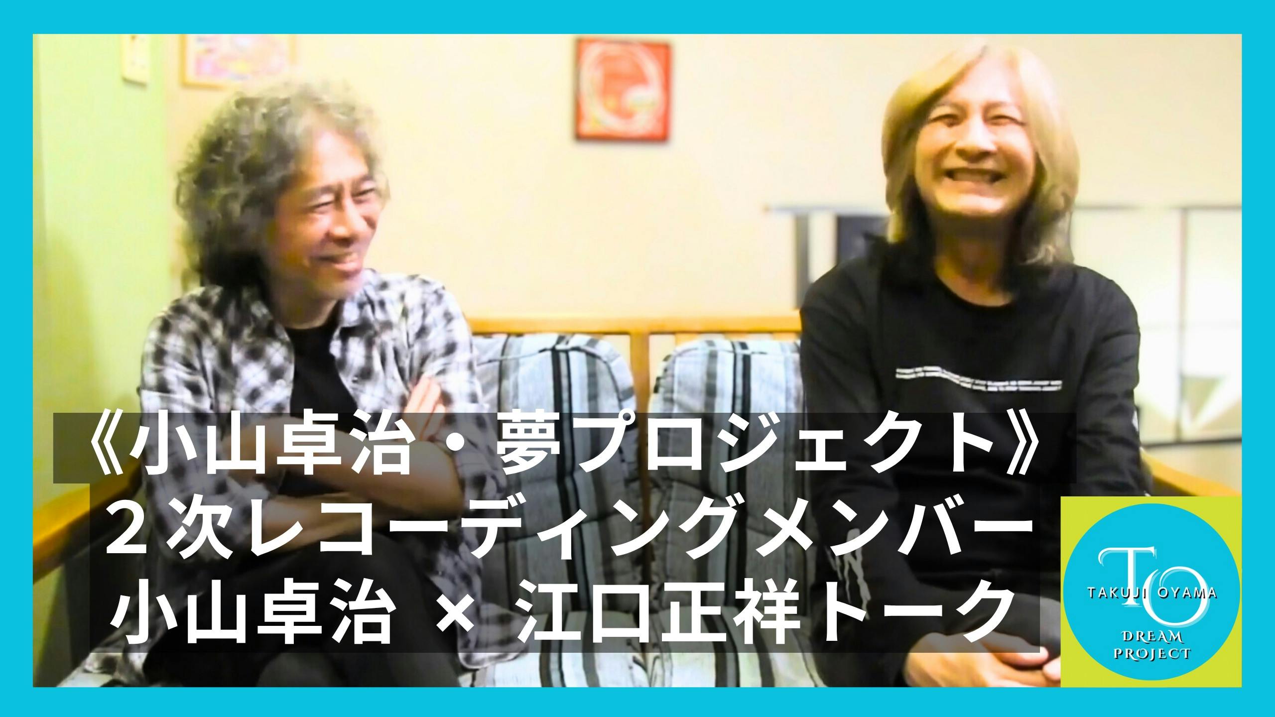 いつも応援ありがとうございます。《小山卓治・夢プロジェクト》は現在、プロデューサー西本明 氏がレコーディングのミックス作業を進めています。そのレコーディング音源のアルバムCD制作を目指して引き続き、夢プロジェクト販売ショップでは1次レコーディング音源(特典付)小山卓治未発表曲の販売によりご支援を募っております。Dreaming on ~夢プロジェクト販売ショップ~そして、近日中に2次レコーディングメンバー全員のサイン集を販売予定です。____________________《小山卓治・夢プロジェクト》2次レコーディングの合間に撮影した尾崎豊バンド《Heart Of Klaxon》メンバーでもあった『ギタリスト 江口正祥さん』と『小山卓治』とのトークを、小山卓治オフィシャルYouTubeよりぜひ、ご視聴くださいませ♪(2分11秒) 《小山卓治・夢プロジェクト》引き続き、応援よろしくお願い致します。”さあ、新しい夢に向けて出発だ!”小山卓治・夢プロジェクト実行委員会