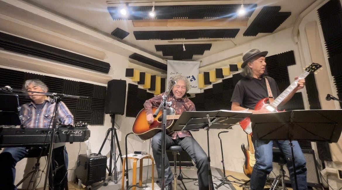 『微熱夜』・・小山さんの元気なカウントからいきなり始まった曲は、一気に僕を微熱夜の世界に引きずり込んでしまいました。長田さんの手から繰り出されるリズムギターが大きなうねりを生み、時折入るリードギターは僕の胸を2つに裂いてしまった。エンディングではギターに西本さんの疾走感のあるピアノの音が追随して微熱気味の渋谷のセンター街を彷徨っているような気分にとらわれました。