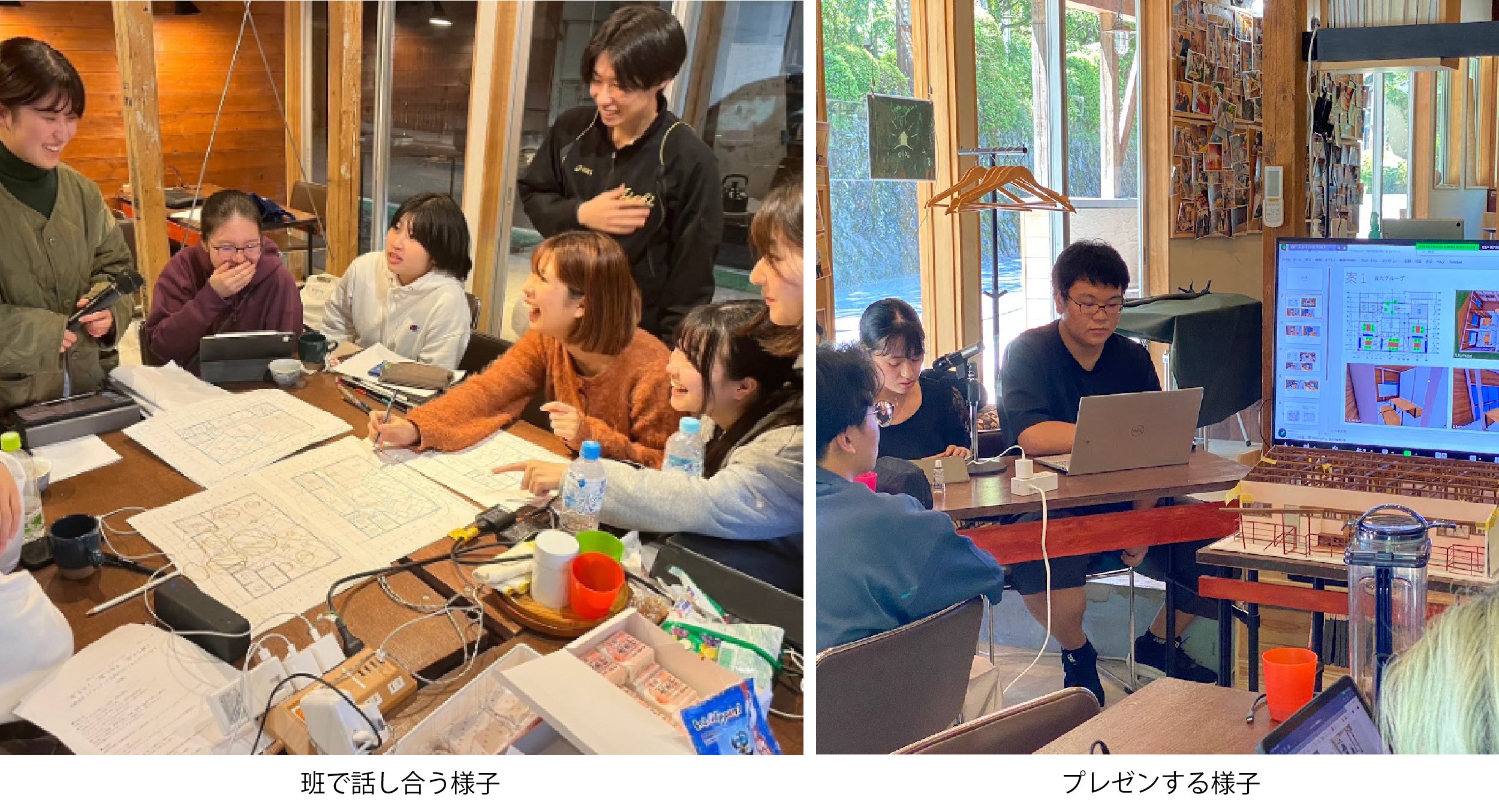 ポテンシャル調査も元にアイデアをみんなで出し話し合い、案をまとめて、施主の小野さんと建築士の藤川さんに発表し、2人のフィードバックをもとに、もう一度班で話し合うことを繰り返して設計案を深めていきました。