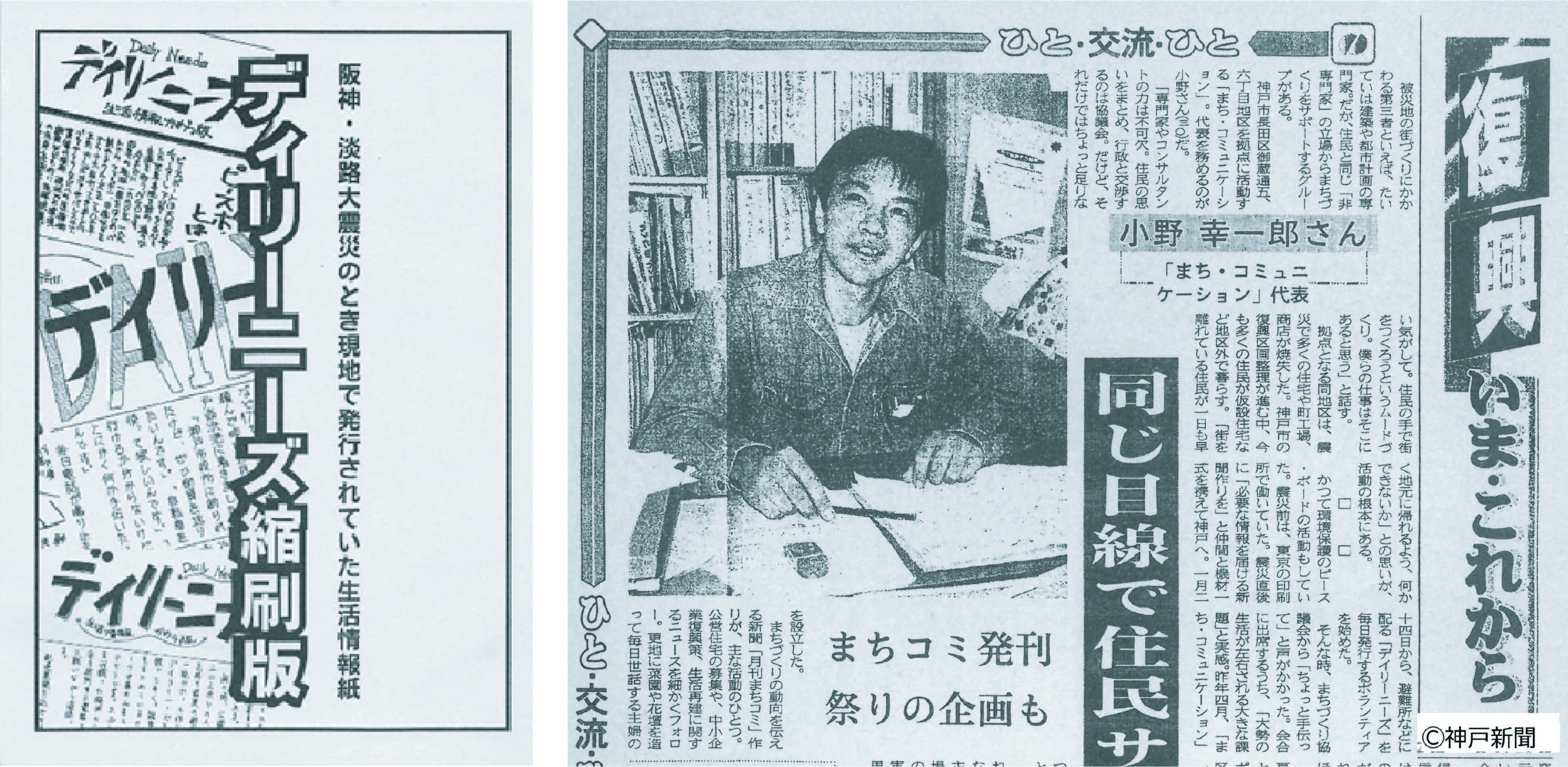 1995年当時、小野は東京の小さな印刷会社で印刷工として働いていました。阪神・淡路大震災の被災状況をテレビで見ていた印刷会社社長の発案で、被災された方々へ情報を届ける活動をするため、船旅企画で世界をまわる活動をしている「ピースボート」の関係者有志と1週間後に神戸市長田区に入り、日刊新聞『デイリーニーズ』を創刊。その後地区の7割以上が全焼した神戸市長田区御蔵通5・6丁目の再建支援を2000年まで続けました。