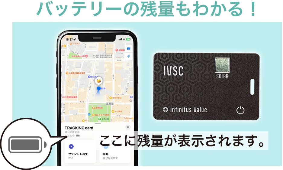 「探す」アプリを開いて登録したカードをタップすれば、簡単にバッテリーの残量がわかります。