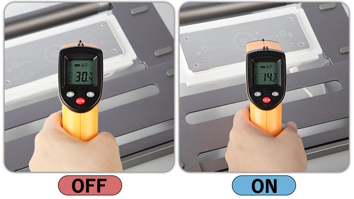 便利なUSB給電式で、ボタンを押すと即冷却開始!表面は14度までクールダウンできます。