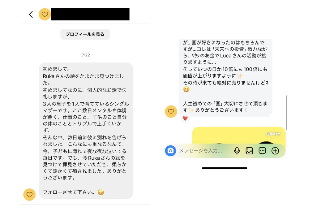 しかし、SNSを通じて多くの方に作品を発表していく中で、次第に「Lucaさんの絵は毎回癒されます」や、「私もアーティスト目指しているんですが、勇気もらいまし」など、「自分の絵が誰かにとって意味のある存在になる」という、予想もしなかった嬉しい反響をいただくようになりました。