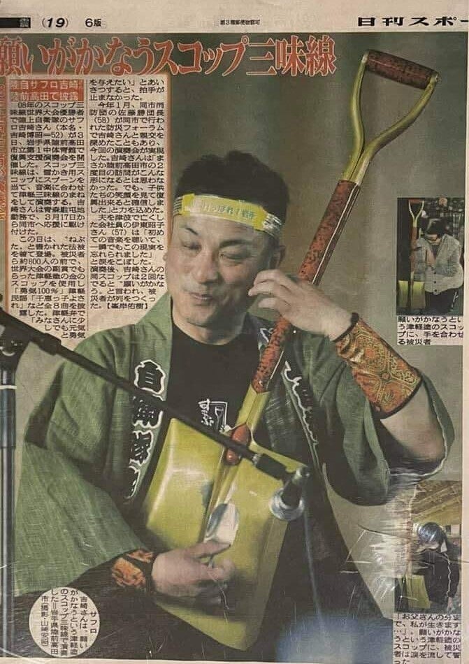 スコップ三味線の演奏をし、新聞に取り上げられました