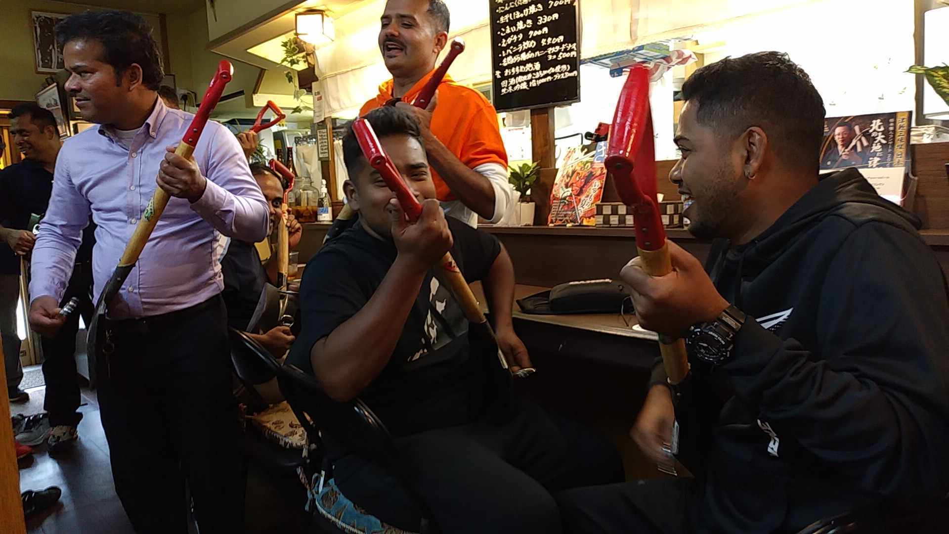 海外のお客様にもスコップ三味線の体験を楽しんで頂いています