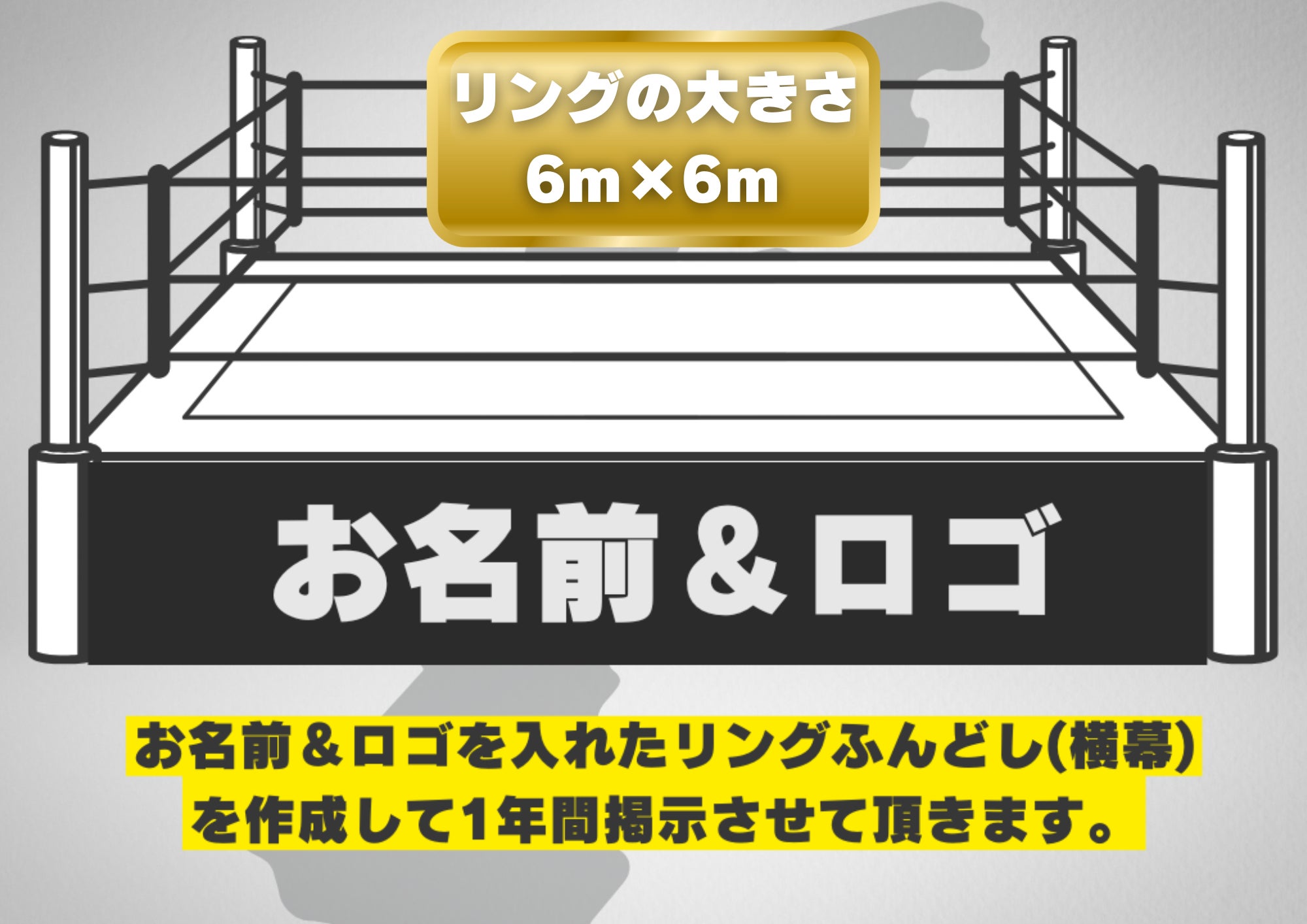 ジム内に設置するリングの横の巨大な幕にお名前&ロゴを掲載させて頂きます。掲載期間は道場オープン日から1年間。備考欄に必ず「掲載するお名前、ロゴありorロゴ無し」をご記入下さい。