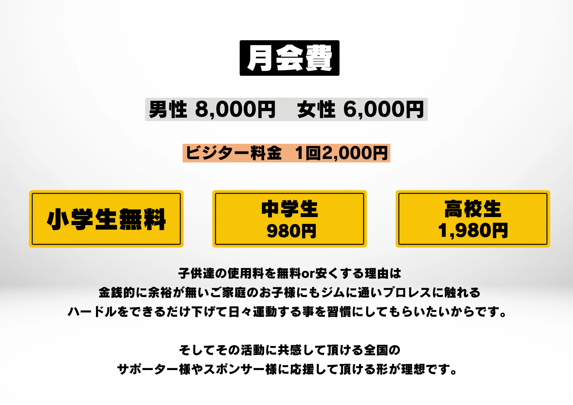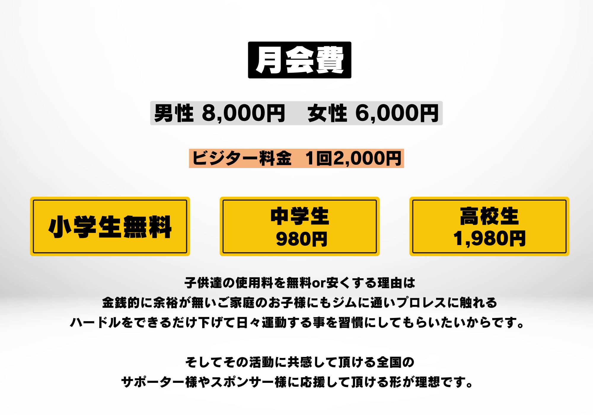 子供達の使用料を無料&安くする理由は、金銭的に余裕の無いご家庭のお子様にも道場に通い、プロレスに触れるハードルをできるだけ下げて、日々運動する事を習慣にして貰いたいからです。