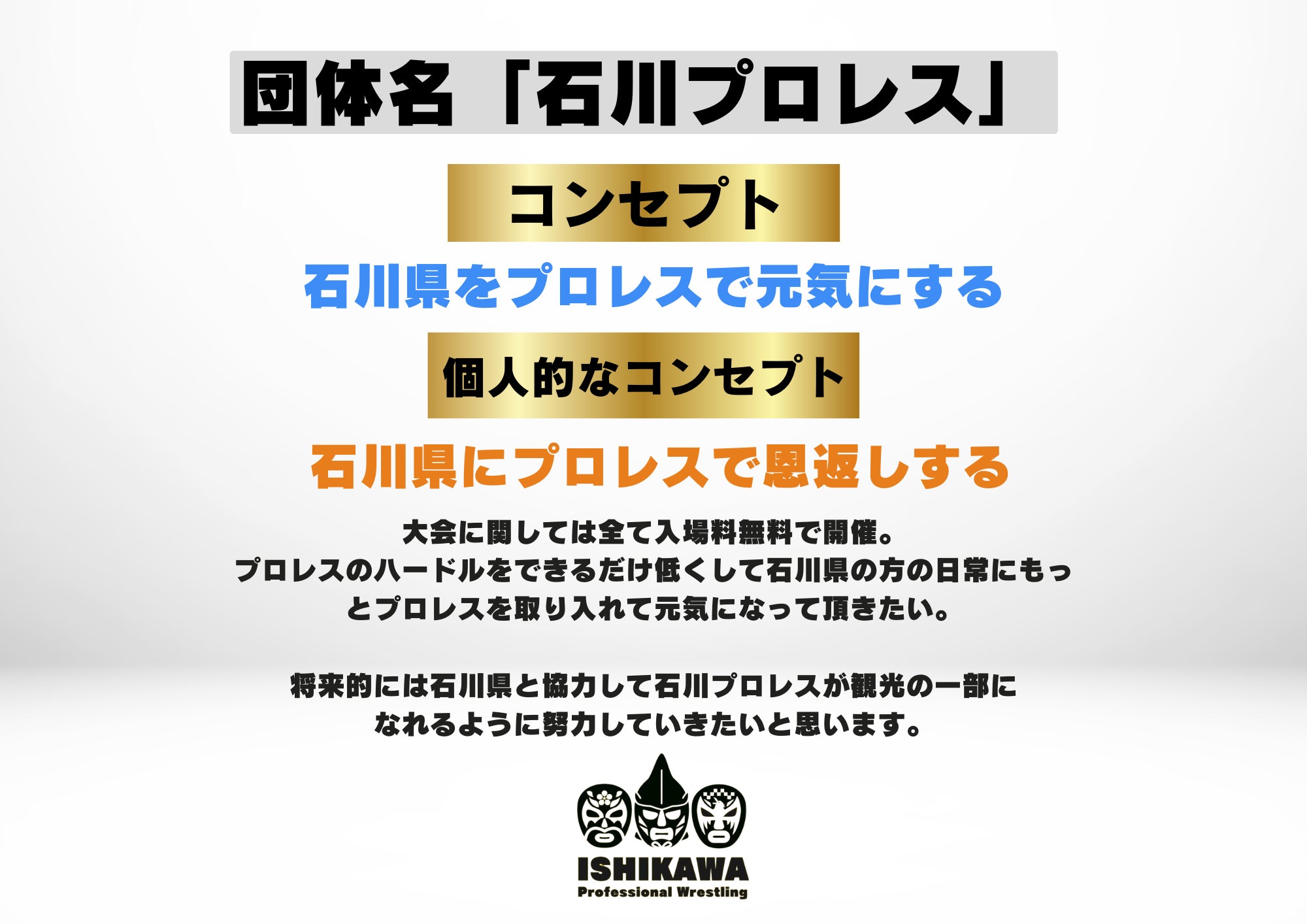 「夢だったプロレスラーになれた今こそ、故郷に何か自分にできる事があるんじゃないか」と感じ「プロレスで石川県を元気にする」というコンセプトのもと、2024年9月23日に入場料無料のプロレスの大会を企画し開催させて頂く事になりました。