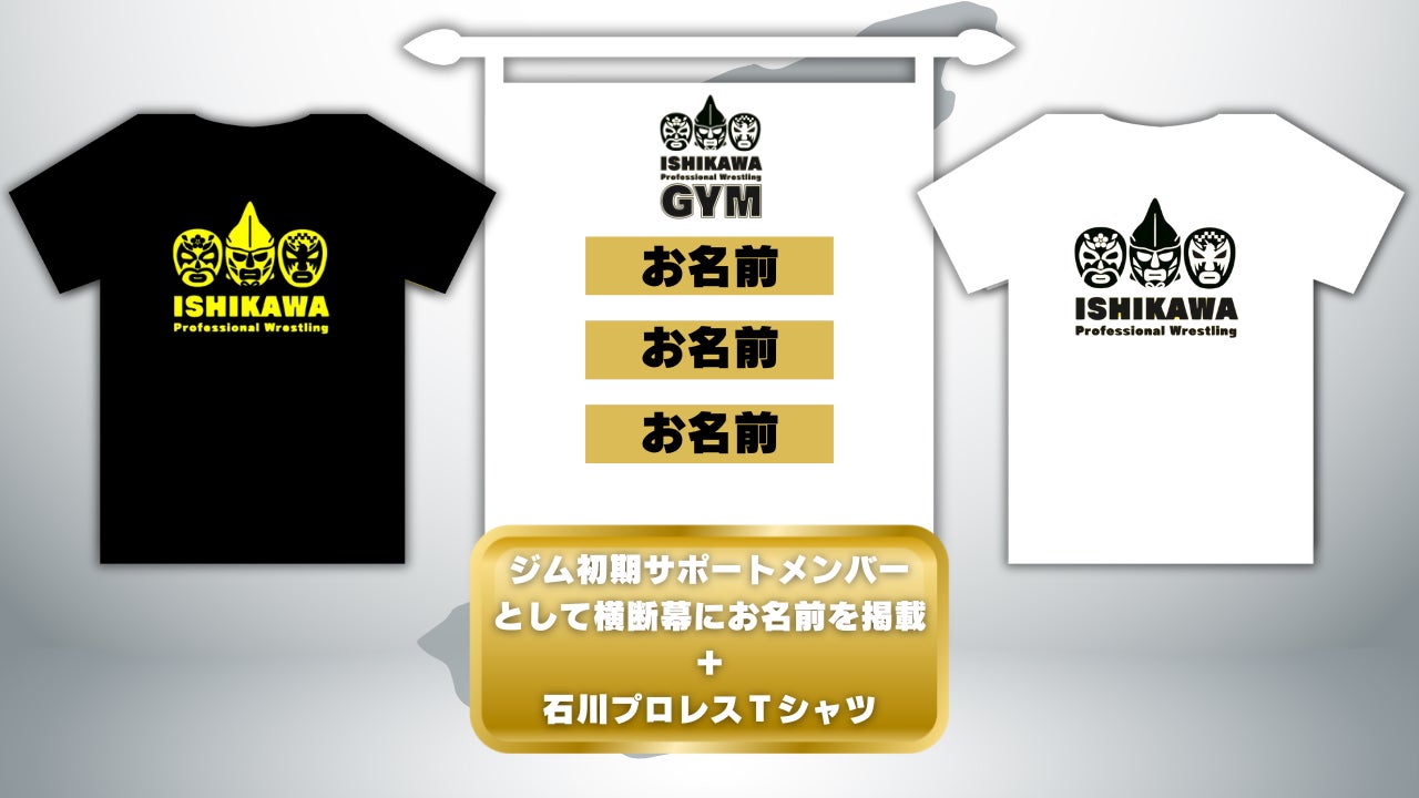 ジムの壁にお名前が入った横断幕を掲載させて頂きます。ジムが存続する限り永久的に掲載させて頂きます。(お名前のみ、写真&ロゴは無し)&石川プロレスの最新ロゴが入ったTシャツ(1枚)をお送りさせて頂きます。(カラーはブラック&ホワイトのみ。サイズはS、M、L、LL)