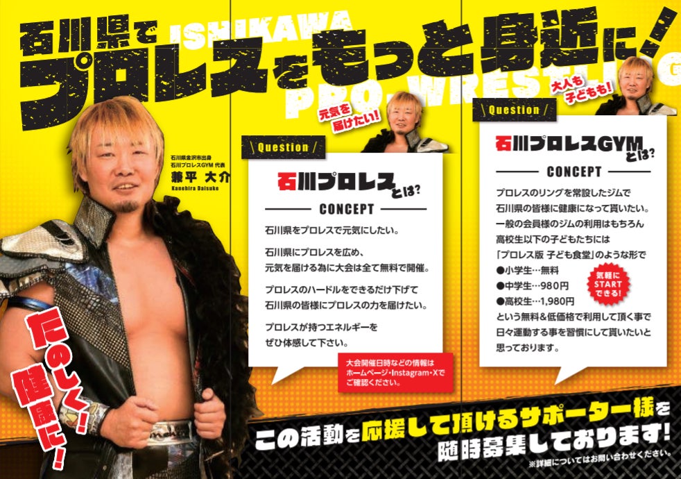 現在2025年春頃に「石川プロレスGYM」を金沢市にオープンできるように準備中です。