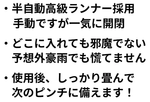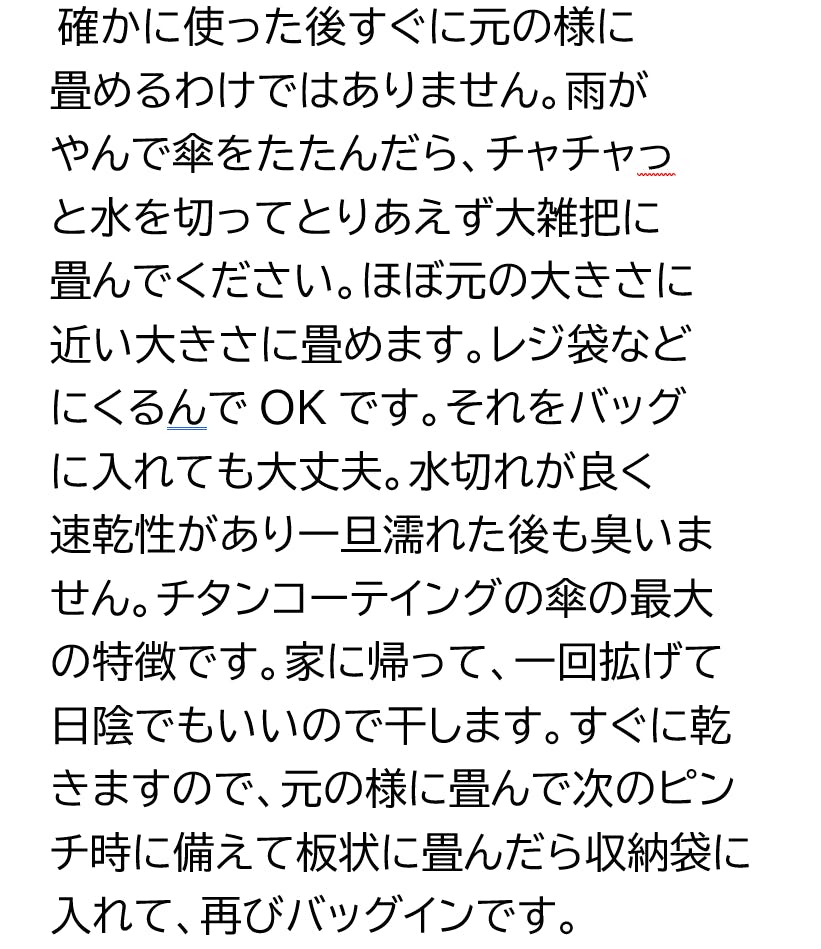 しっかり上から流水を施し、タオルでサッと拭いて、一通り水分がなくなるまで天日干ししたら、数分後、温度が下がったら、次のご使用に備えて、きれいに畳みましょう。この愛情が、又来るであろうあなたのピンチを救ってくれるのです。