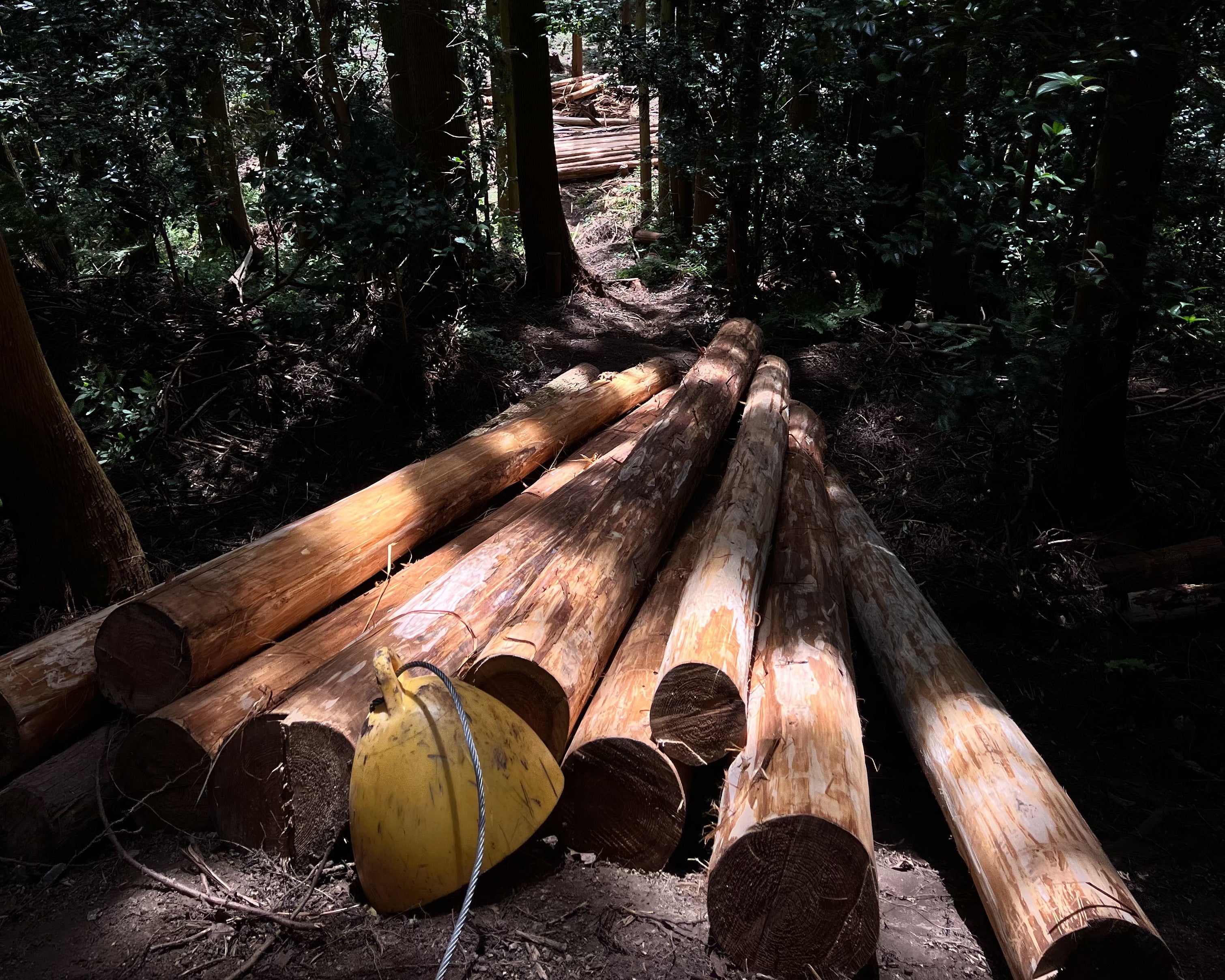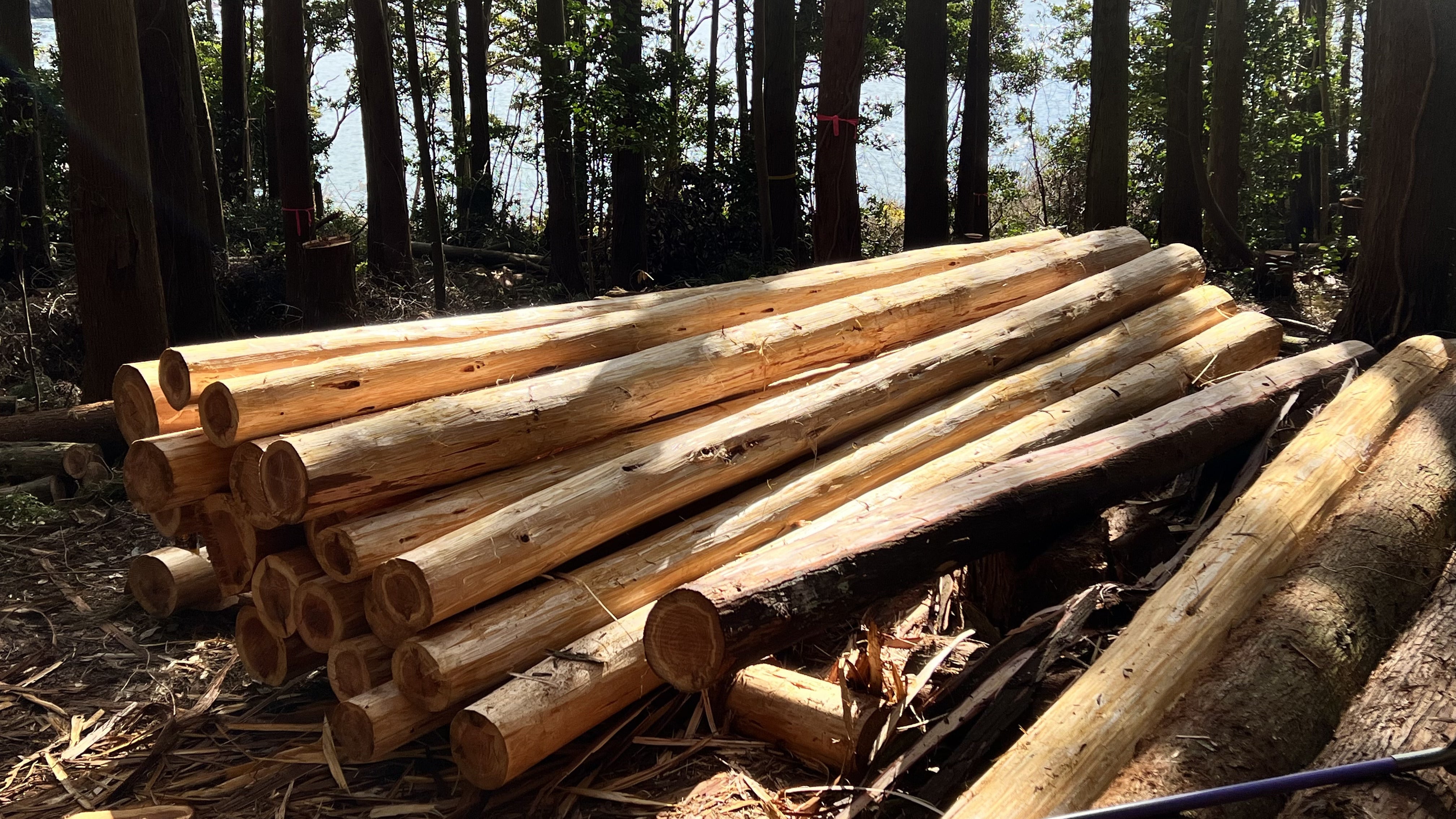 サウナの建材として使用する長さにカットしたのち皮を剥いていきます。