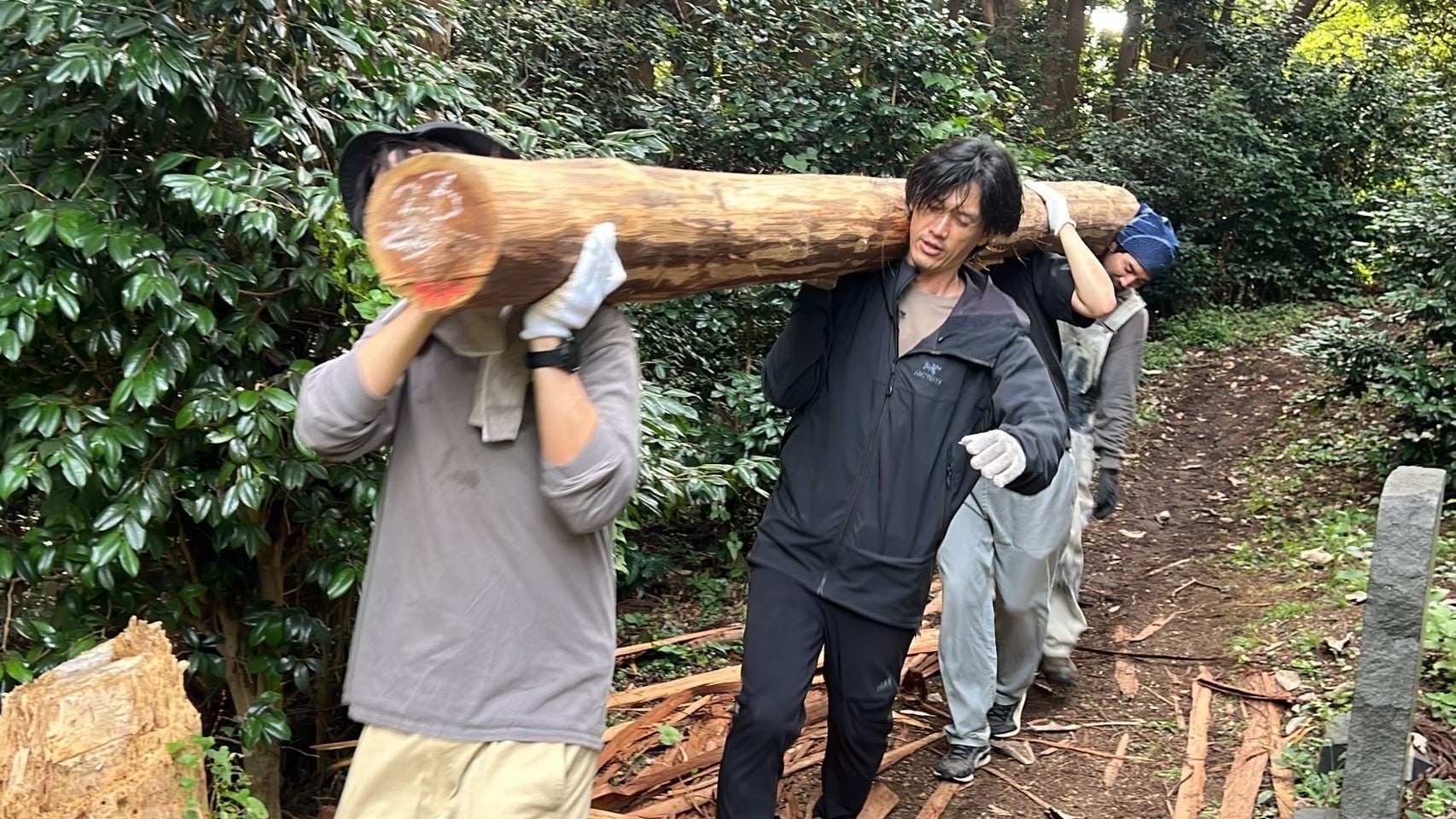 60本以上の丸太をサウナ建設地まで運搬するため、たくさんの方にご協力いただきました。