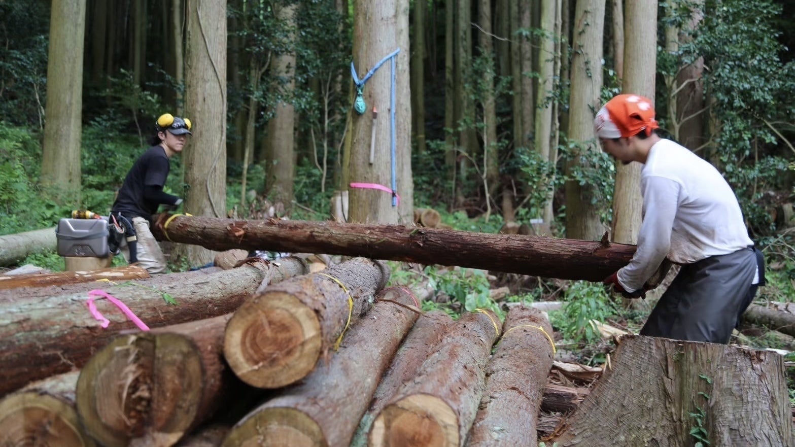 間伐した杉は丸太としてそのままサウナの建材に、建材として使用できないものはサウナストーブ用の薪として活用、薪を燃やした後の灰を森に撒くことで土壌の改善を促し、枯れた沢に水が戻ることを目指します。