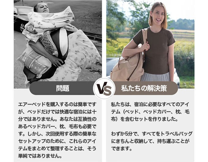 その理由は、従来のエアベッドにおける「寝心地の悪さ」「持ち運ぶ際の不便さ」そして「準備や片付けにかかる時間」を解消することが主な理由になります。