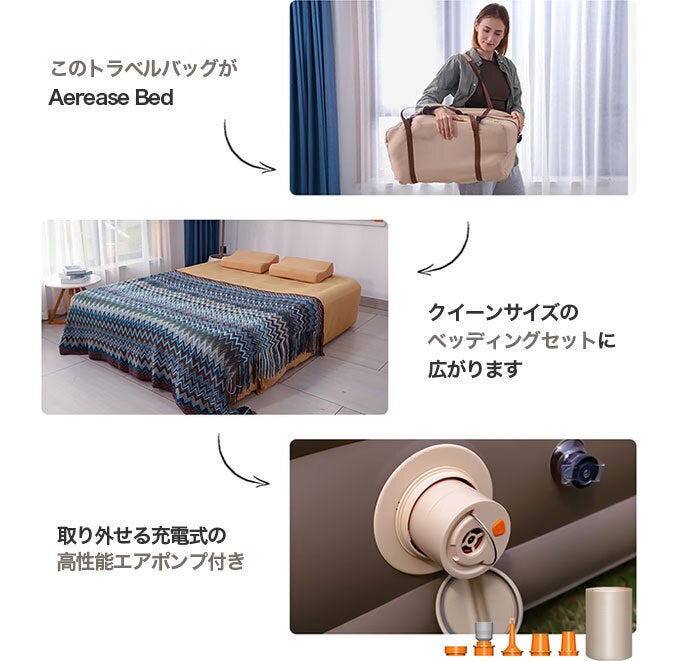 寝具を外に持ち運んだり、移動させたい時は多くの荷物を持って何往復もしたりする必要があります。ですが、AEREASE BEDは「ベッド本体」はもちろん、、、