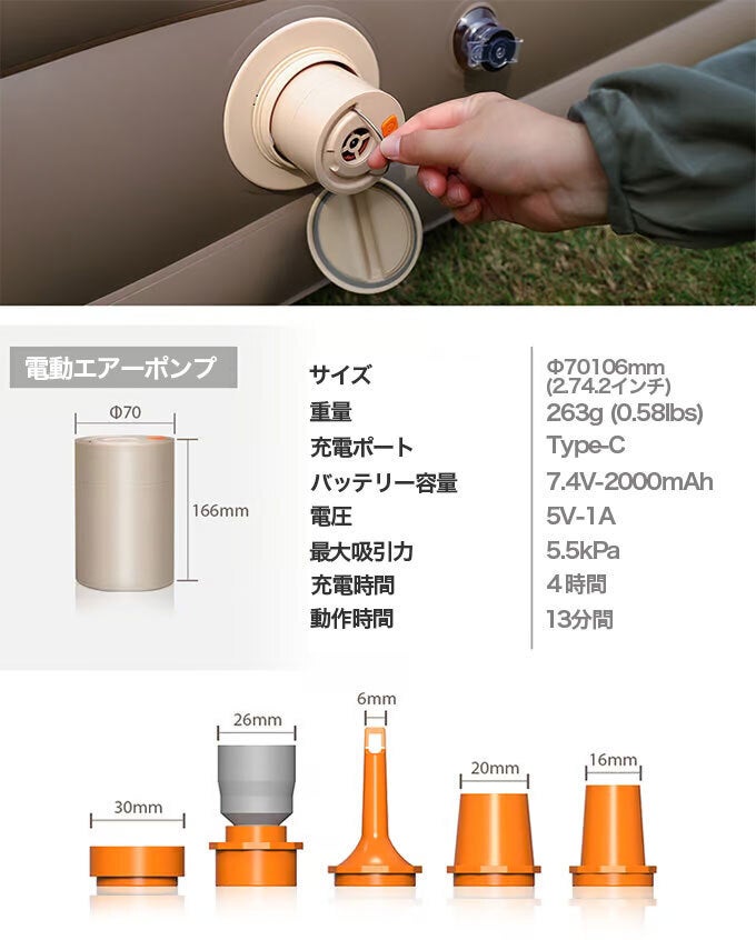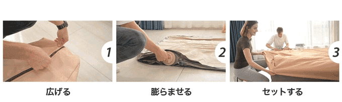充電式の高性能ポンプなので、どこでも3STEPで一流ホテルの寝心地がサクッと実現します。