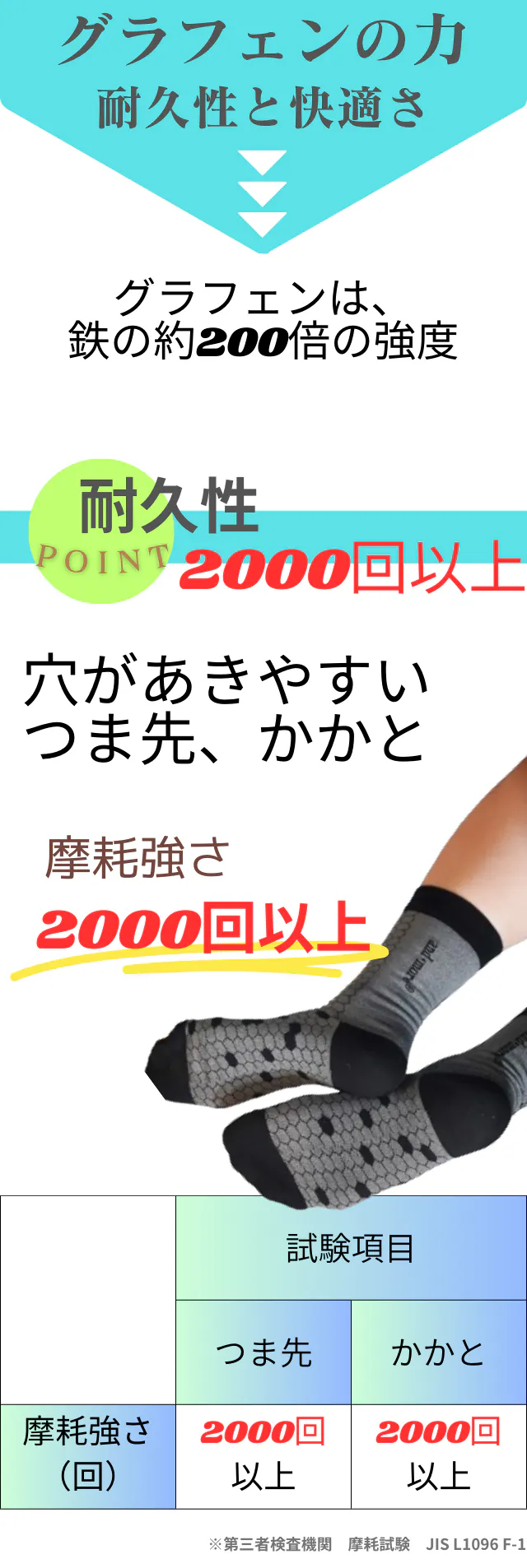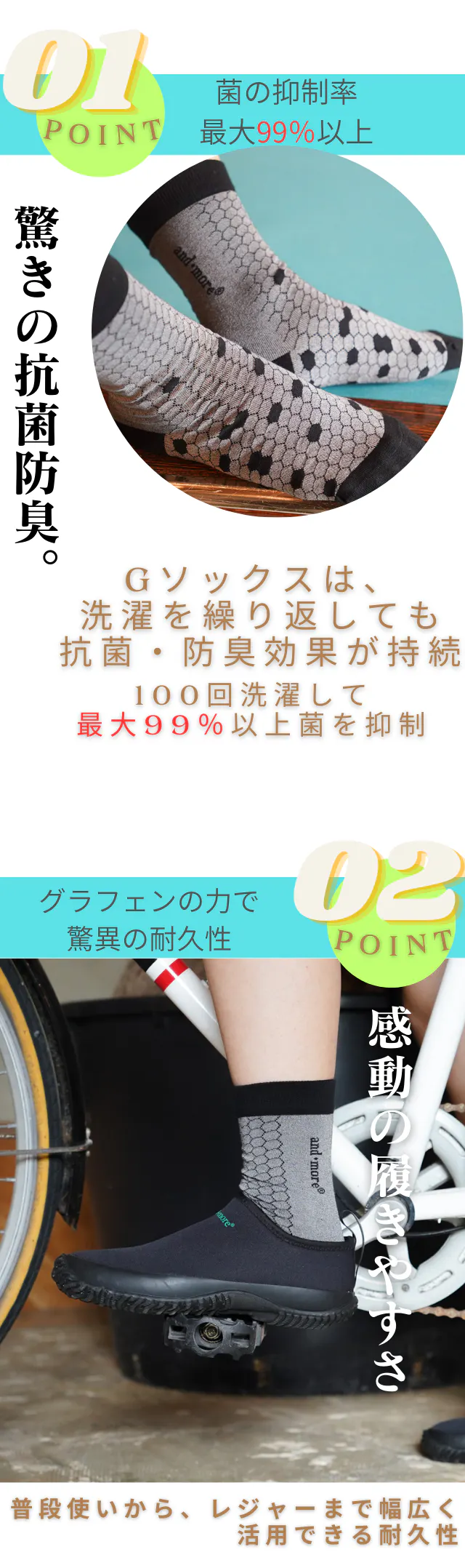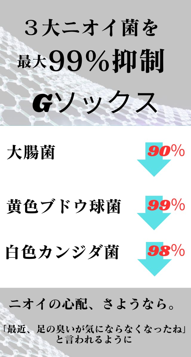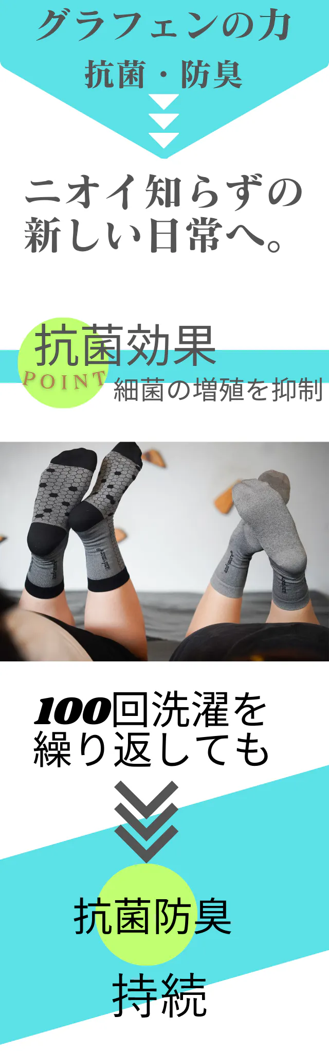 Gソックスは糸にグラフェンを練りこむ独自技術により高い抗菌・防臭を実現しています