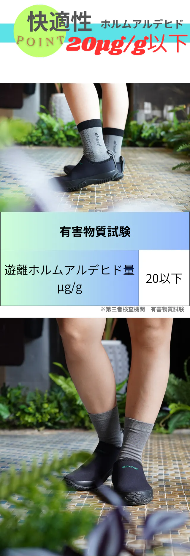 厳しい有害物質試験をクリアし、ホルムアルデヒドは基準値を大きく下回り(20µg/g以下)以下に抑えています。肌にやさしい靴下です
