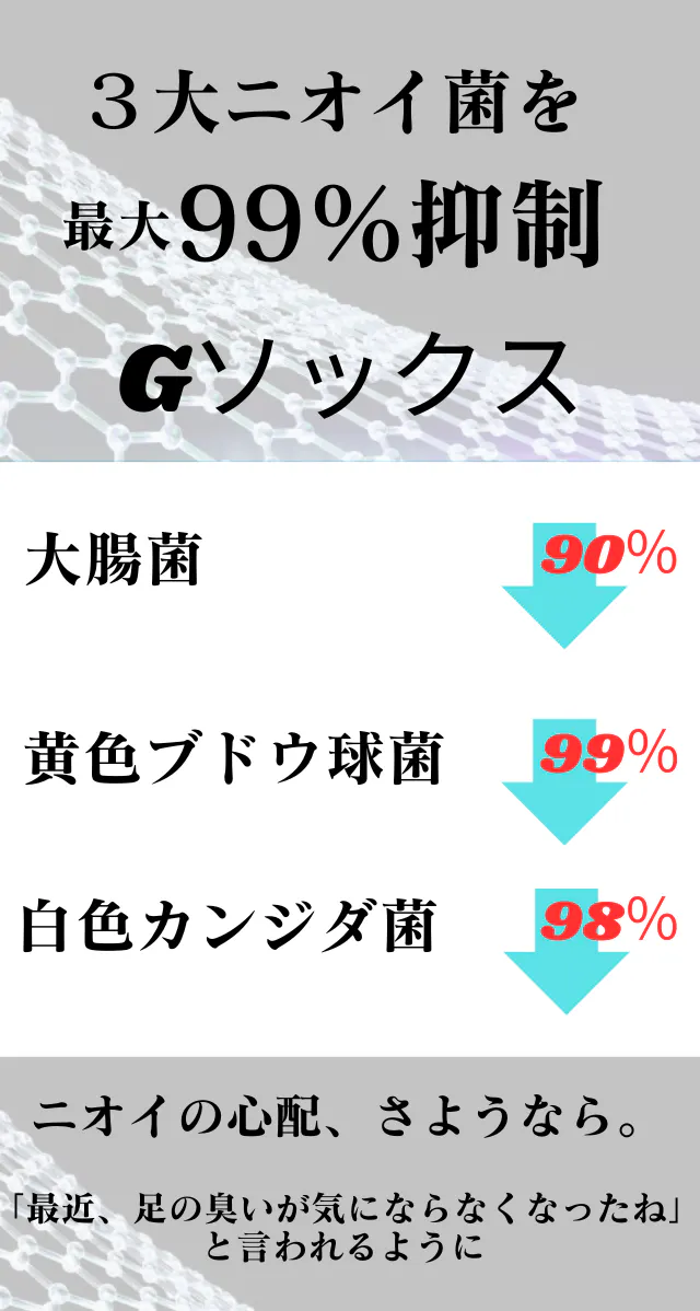朝から履いているGソックスが、長時間使っても、いつまでも爽やかで清潔なまま。 グラフェンの抗菌性が、足元を細菌から守り、ニオイの原因を根本から抑えます