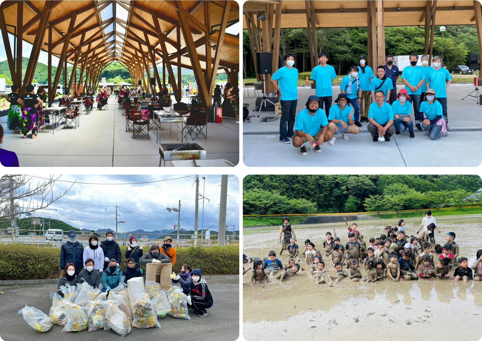 (右下)温泉の目の前の田んぼで開催した泥遊び企画今後は「泊まれるカフェ 龍さん家」をオープン予定。