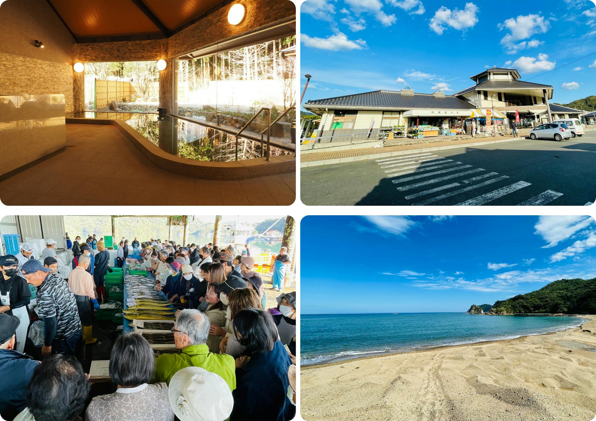 また、海の幸も豊富で(左下)、夏場は海水浴も楽しめます(右下)