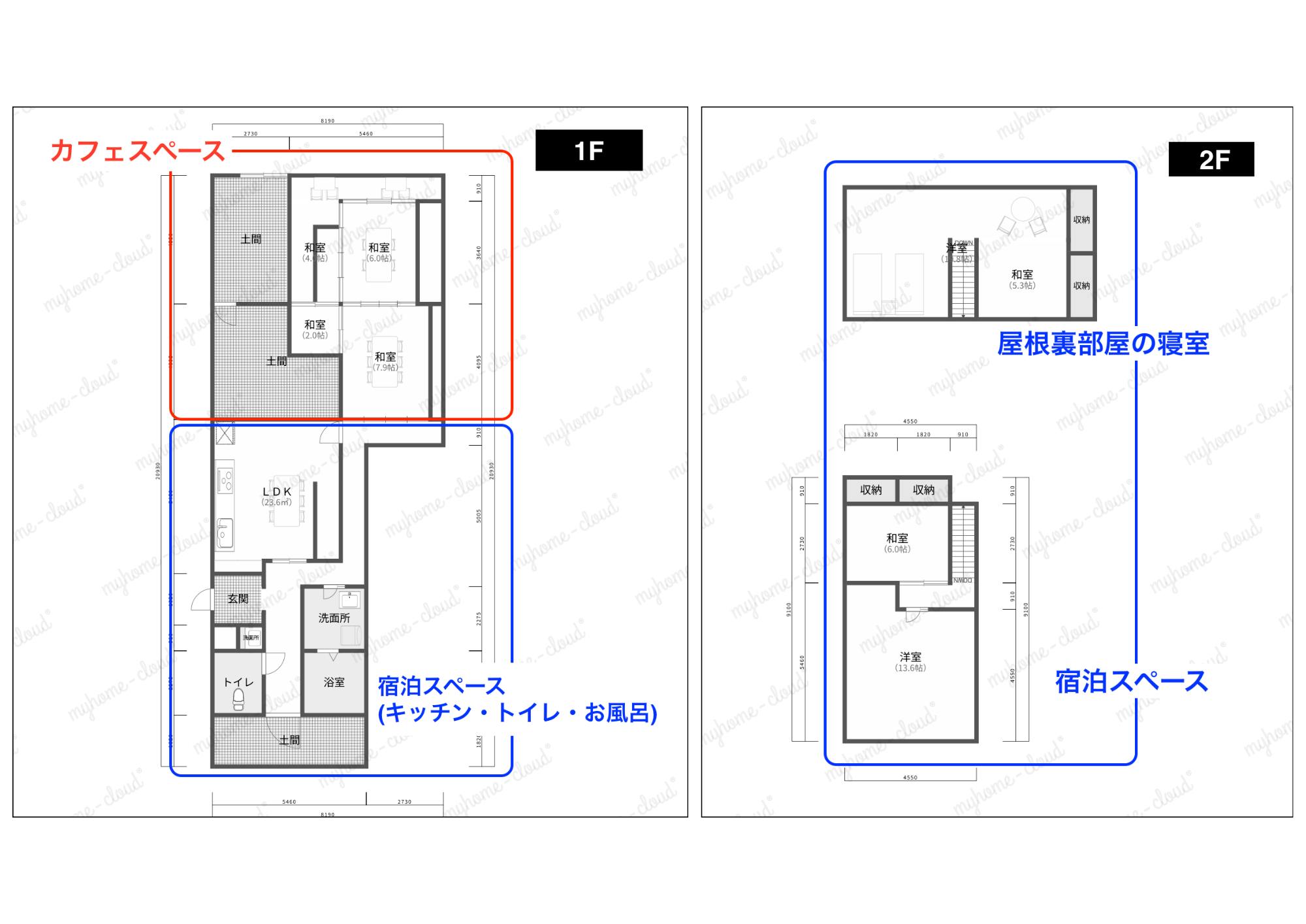 ・1階はカフェ・飲食スペース、2階の風情ある屋根裏部屋が宿泊スペース