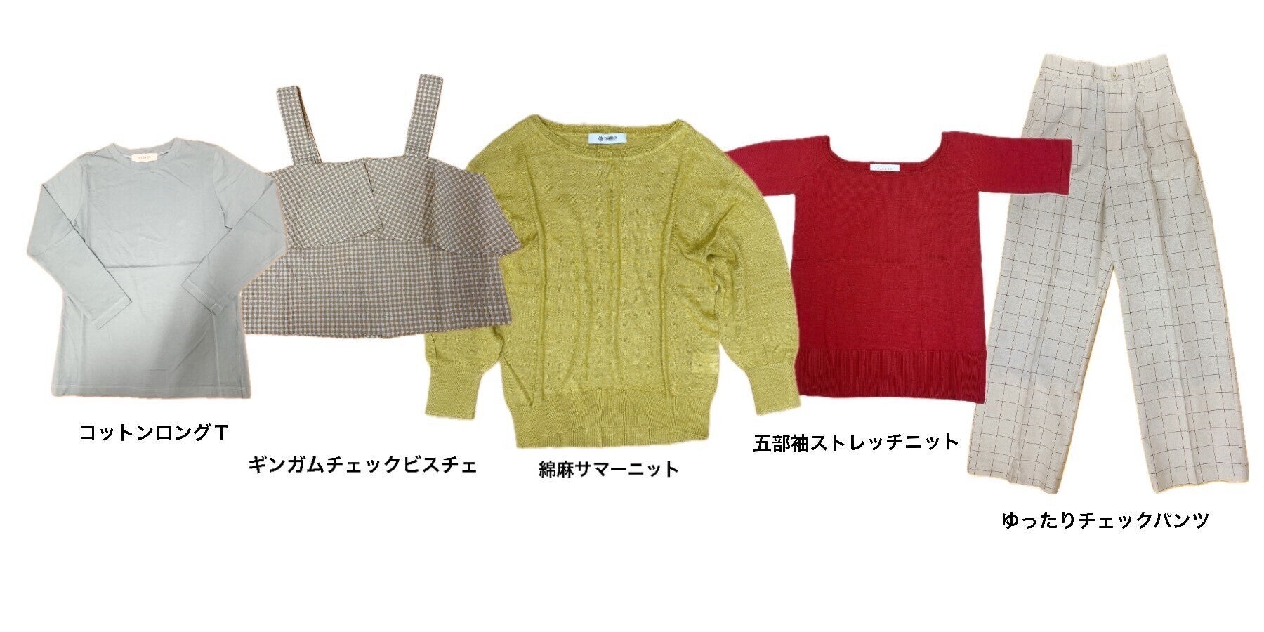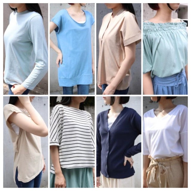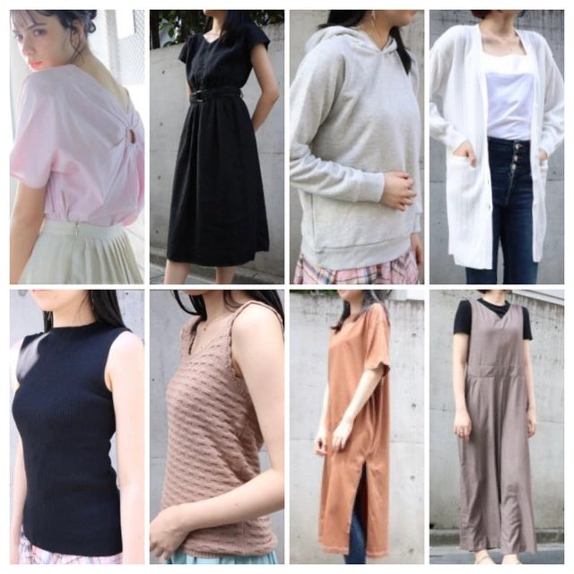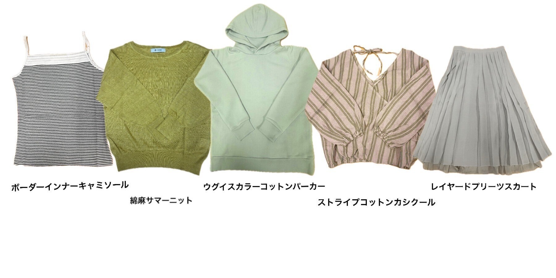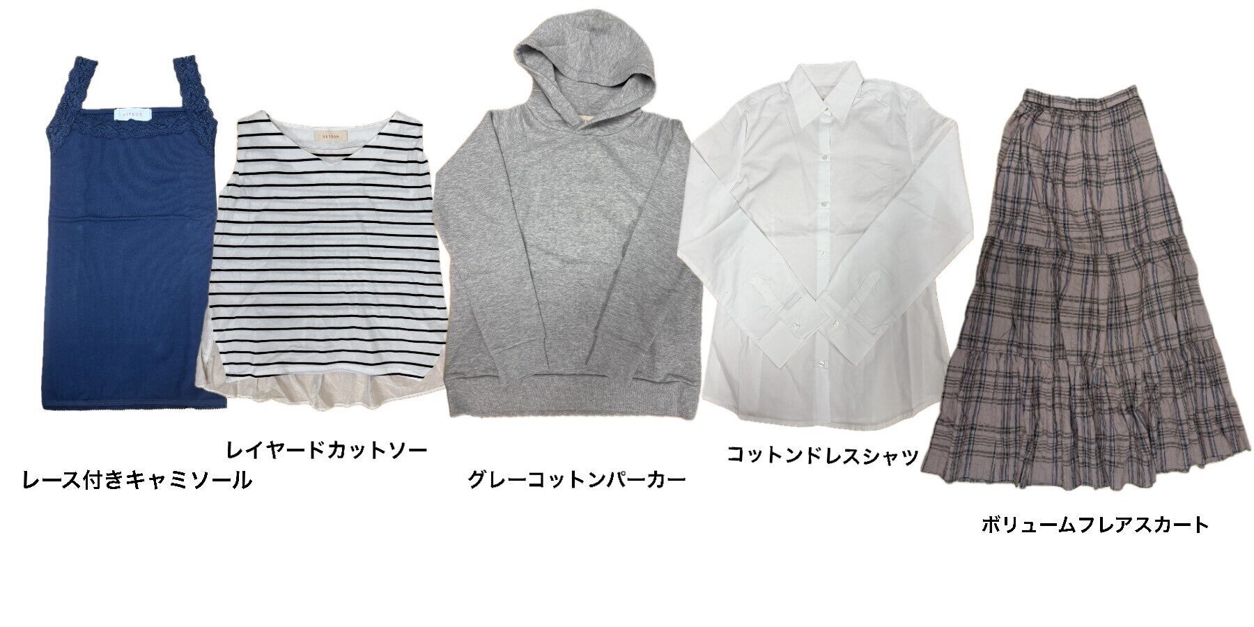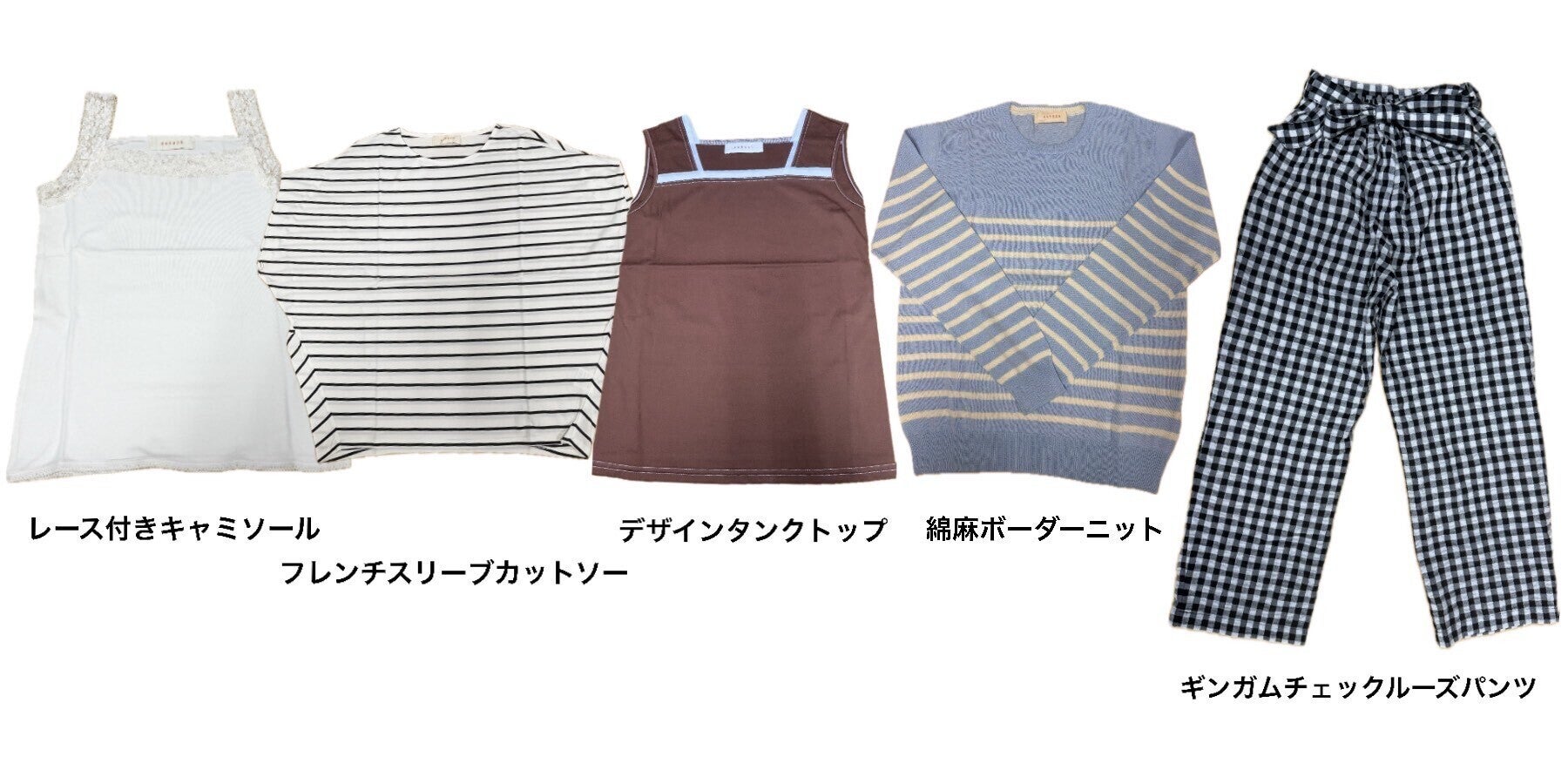 インナー、キャミソール、シャツ、カットソー、カーディガン、ワンピース、ブルゾン、スカート、パンツと多種多様。(下段の商品写真を参照ください。)