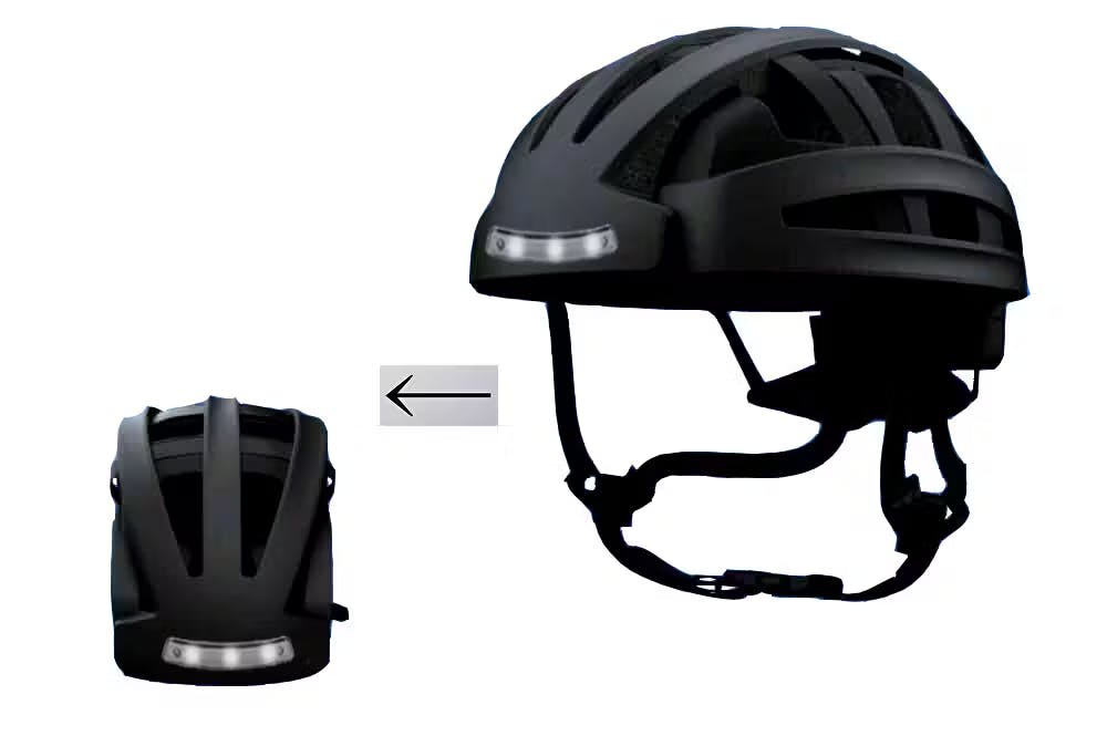 そこで、そんな課題を解決するために、ヘルメットをたたんでコンパクトにバッグに収納できる、という画期的なヘルメットを開発しました。
