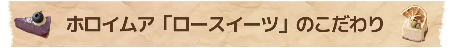 ホロイムアのロースイーツは、ケーキもアイスも、全て店内で1から手作りしています。アイスは、40分ほどかけて、ゆっくりじっくりと回転させて仕込んでいるため、大変なめらかな舌触りとなっています。優しい味わいに仕上げる澄んだおいしさをぜひお楽しみください!