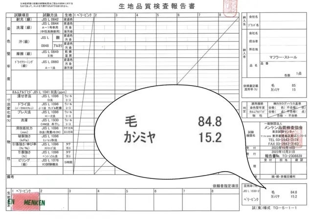 日本の正式な品質検査機関で顕微鏡混率検査を実施し、間違いなくカシミヤが15%超含まれていることが証明されています。