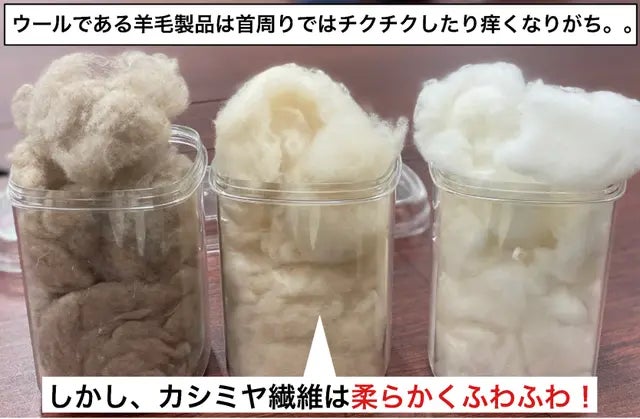 柔らかくふわふわなこのカシミヤをブレンドすることで皮膚刺激を減らして、あのストレスの感じるチクチク感を軽減!