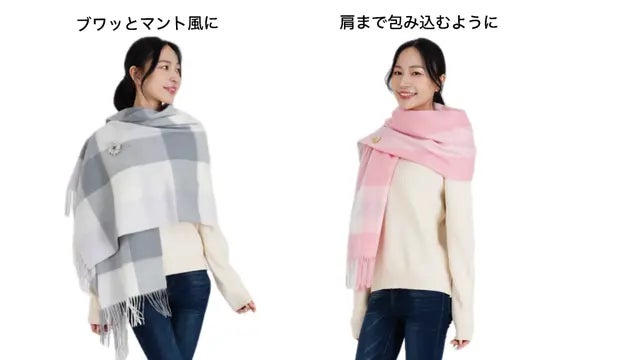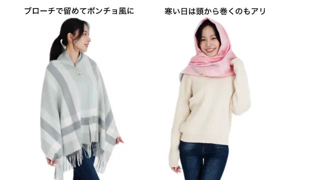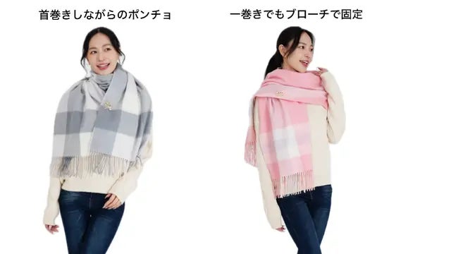 超大判マフラー(特大サイズ)とブローチは非常に相性が良いです。ブローチ使用で巻き方バリエーションが無限に広がります。また付けるだけでもワンポイントのオシャレを演出します。