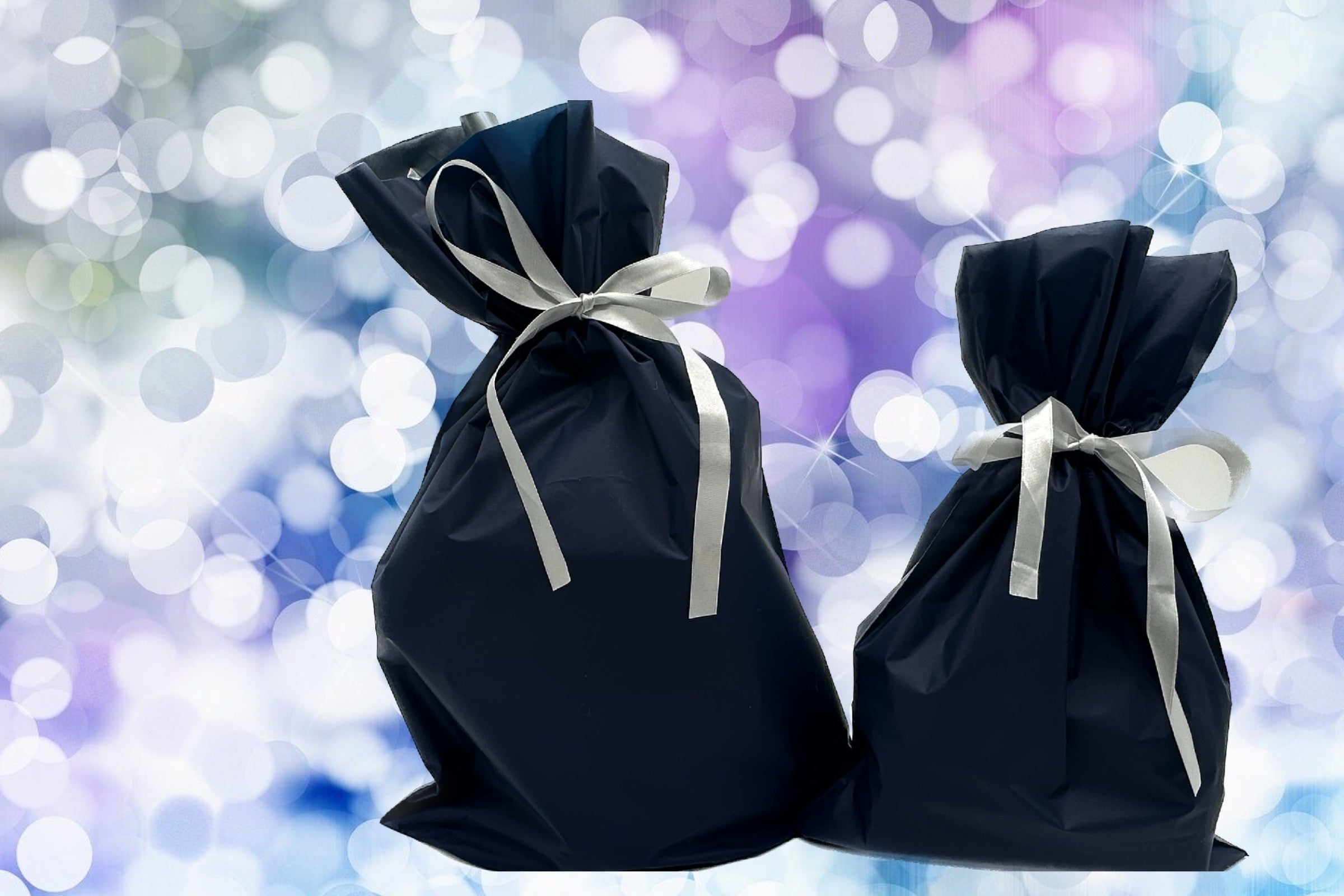 これからのギフトシーズンに最適なリボン付きの可愛いネイビーの巾着袋です。