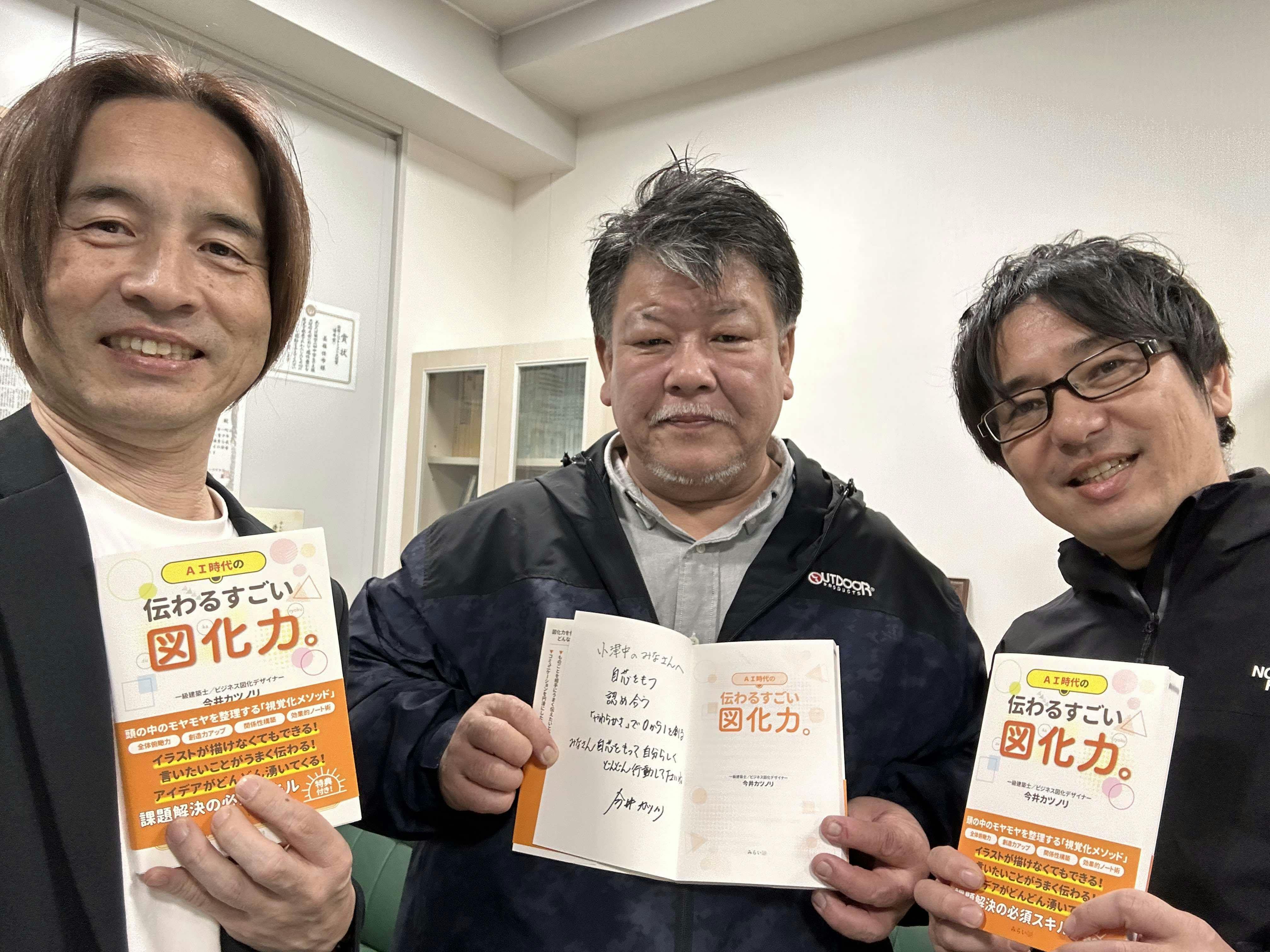 今井カツノリが講師をしている泉大津市立小津中学校に本書をお届けしました!(高橋校長・中央と大達主席・右)