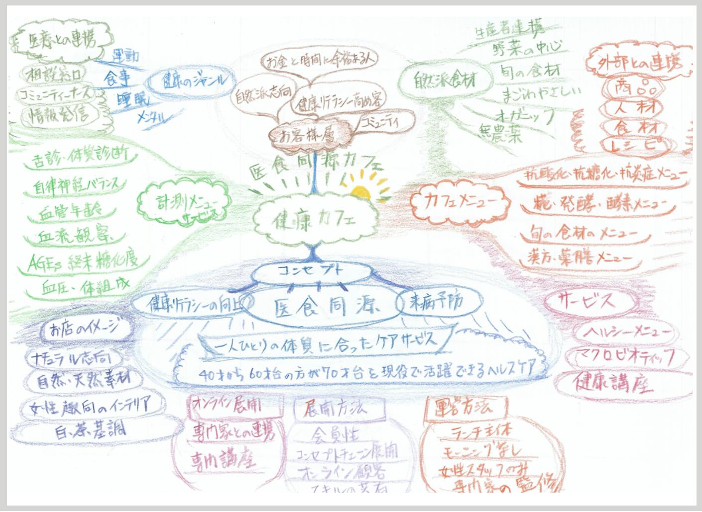 上の図は、健康をテーマにしたカフェの構想を図化したものです。
