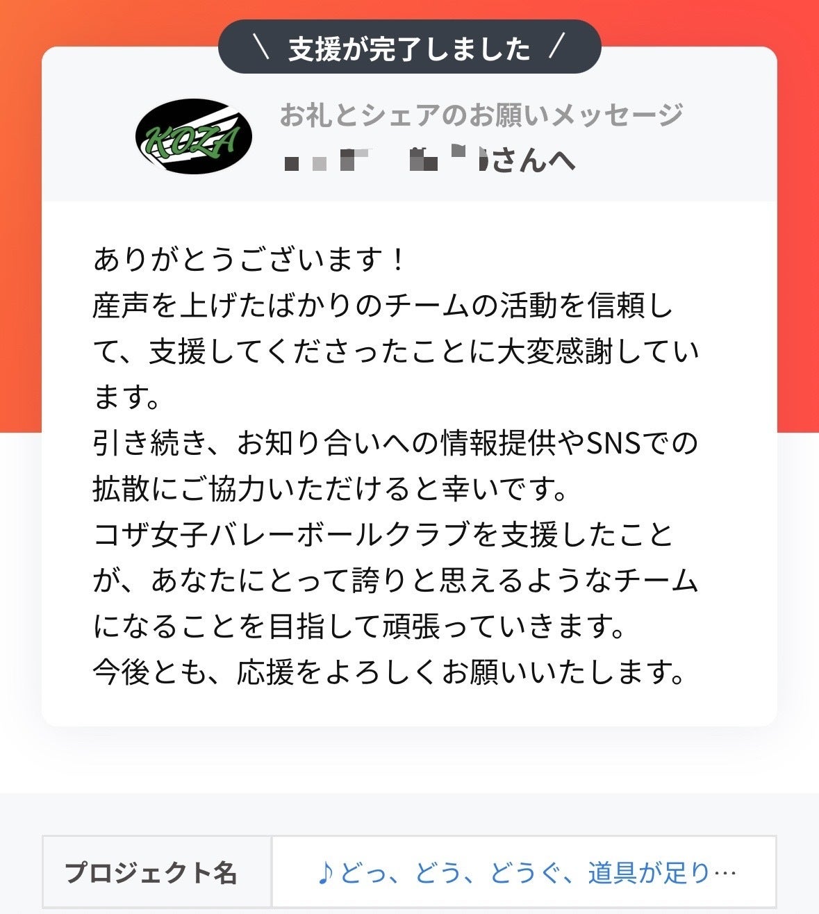 あと3時間で本プロジェクト終了となります。終了後、支援なされた方々へリターンを行っていきます。支援をしてくださった方々に対して、本プロジェクトのリターンを実施していくことはもちろんですが、支援の際に送られるメッセージである上の画像からわかるように「コザ女子バレーボールクラブを支援したことが、あなたにとって誇りと思えるようなチームになることを目指して頑張っていく」ことこそが、最大のリターンであることを、選手だけではなく、チームの関係者みんなが自覚をして活動を進めていきます。また、その気概をしっかりと継承もしていきます。本プロジェクトSUCCESSの喜び以上に、素直に「ありがとう」という感謝の気持ちと、支援のたびに送られるエールに「応えなければ」という気の引き締まる思いでいっぱいです。プロジェクトの立ち上げを支援してくれたCAMPFIREのスタッフの方、プロジェクトの活動をしていったチーム関係者、プロジェクトを信頼して賛同してエールを送りながら支援してくれた方々、本当にありがとうございました。今後は、チームのInstagramから活動を見守って頂けたら幸いです。
