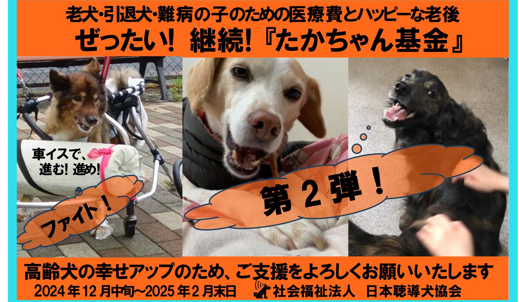 ボク(だいすけ)の他に、10頭のシニア犬と闘病犬の医療費が必要です。 この子たちのために、これからもご支援をよろしくお願いいたします。 元旦からこんなお知らせをするのは申し訳ないのですが、このクラウドファンディングでナビゲーターをしているだいすけ(17歳3ヶ月)です。 お伝えするのが辛いのですが、ボク、年末に急逝しました。 その前の日には、車椅子で快走し、ほどほどご飯を食べ、お水もたっぷり飲んで、ボクとしては「来年も、みんなと遊ぼう」と思っていたんですが、毎晩3回(12時か14時か16時)の排尿タイムの後に、どうも、2度目の脳疾患が起こったんだと思います。 スタッフさんたちは「穏やかで笑顔の死に顔ねぇ」って言ってくれるけど、死んでも鼻血が出続けました。脳梗塞なのかなぁ。 応援してくださいましたみなさま、ボクのために揺れ揺れ車いすや福祉器具を作ってくださったボランティアAさんとTさん。作業療法士の先生、スタッフさんに感謝です。 こんな幸せな老後を、他の子たちにも過ごしてほしいから、 ボク2代目代表犬として、これからもナビさせていただきます。よろしくお願いいたします。 ぜったい永続! 引退犬&闘病犬の医療補助『たかちゃん基金』を支えたい