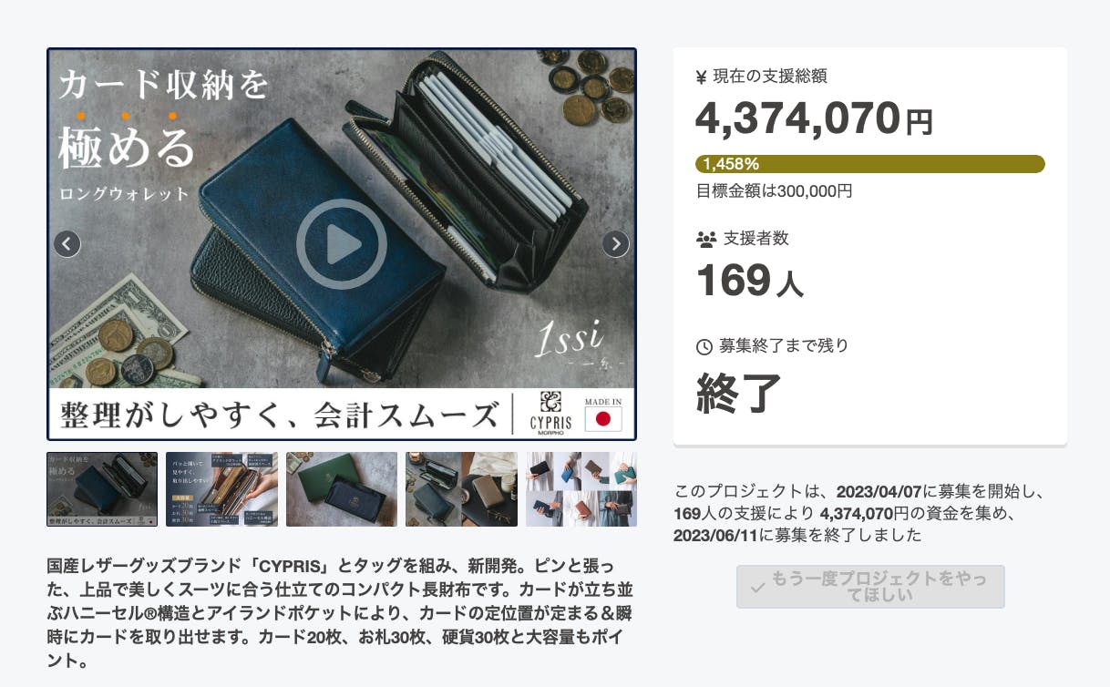 「matowa」と同じハニーセル®︎構造を採用した長財布「1ssi」のクラウドファンディングでは、400万円以上のご支援をいただきました。