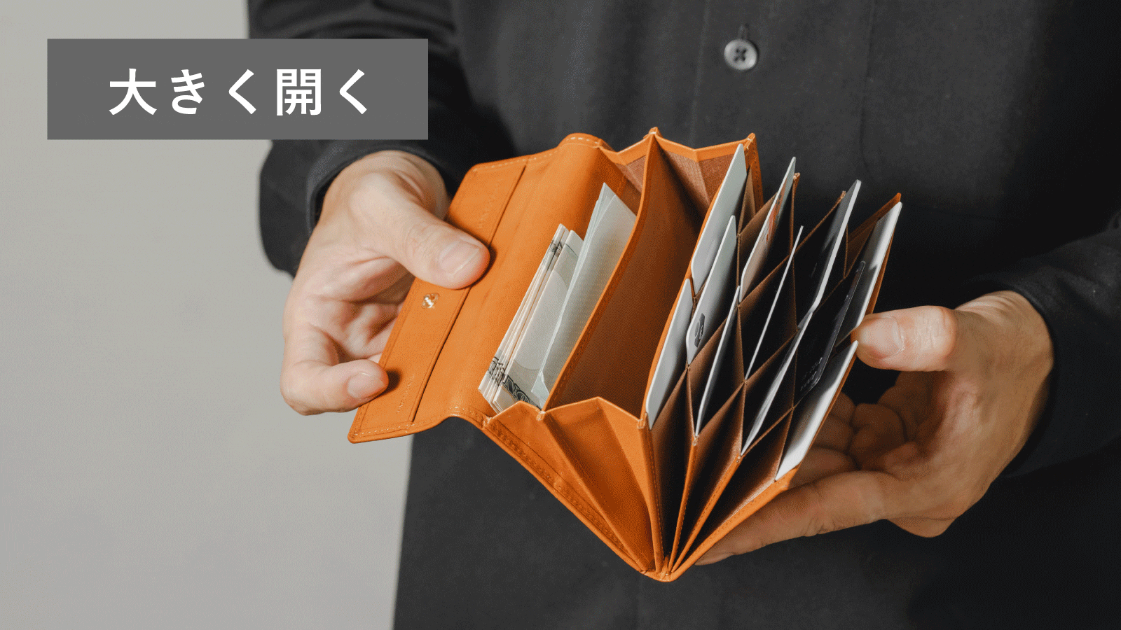 パスポートほどのコンパクトさのお財布なのに、カードがたくさん入る。大容量でスリム。