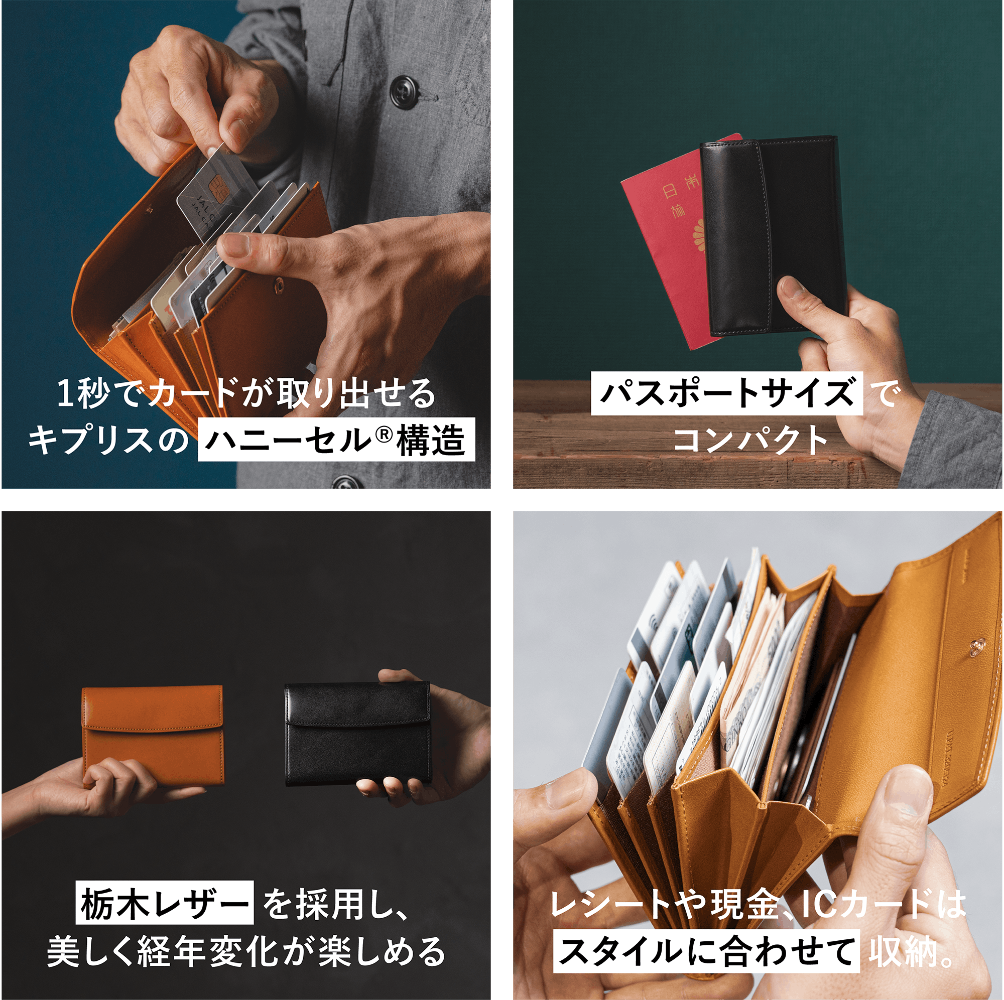 また、技術の結晶であるハニーセル®︎構造はカードが取り出しやすいだけでなく、カード収納をコンパクトに設計できるという強みも。