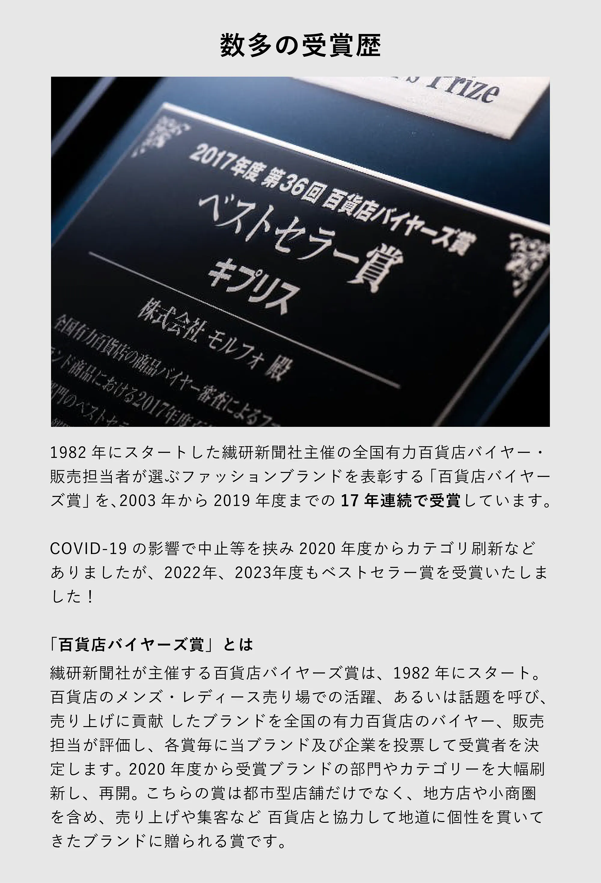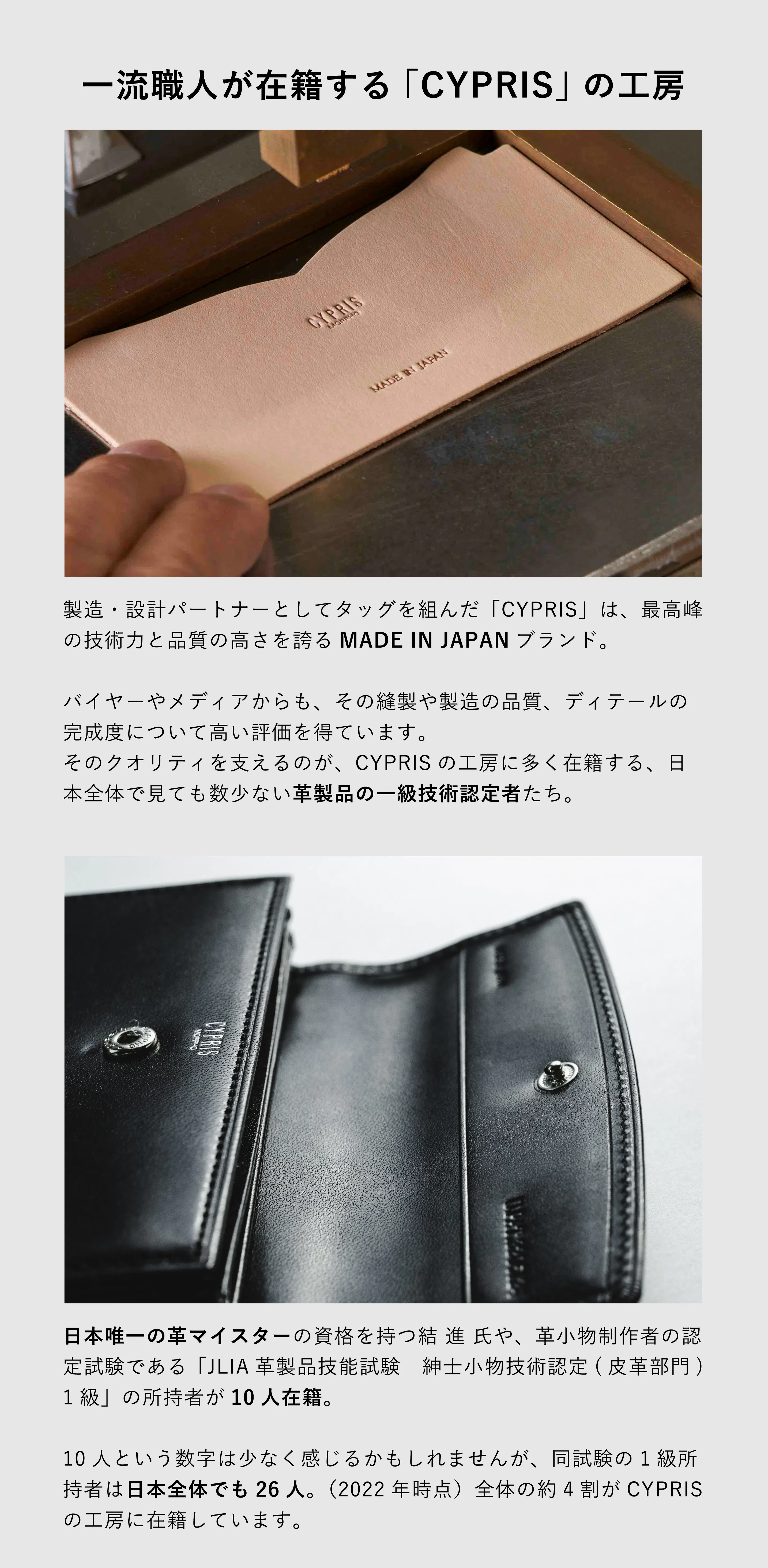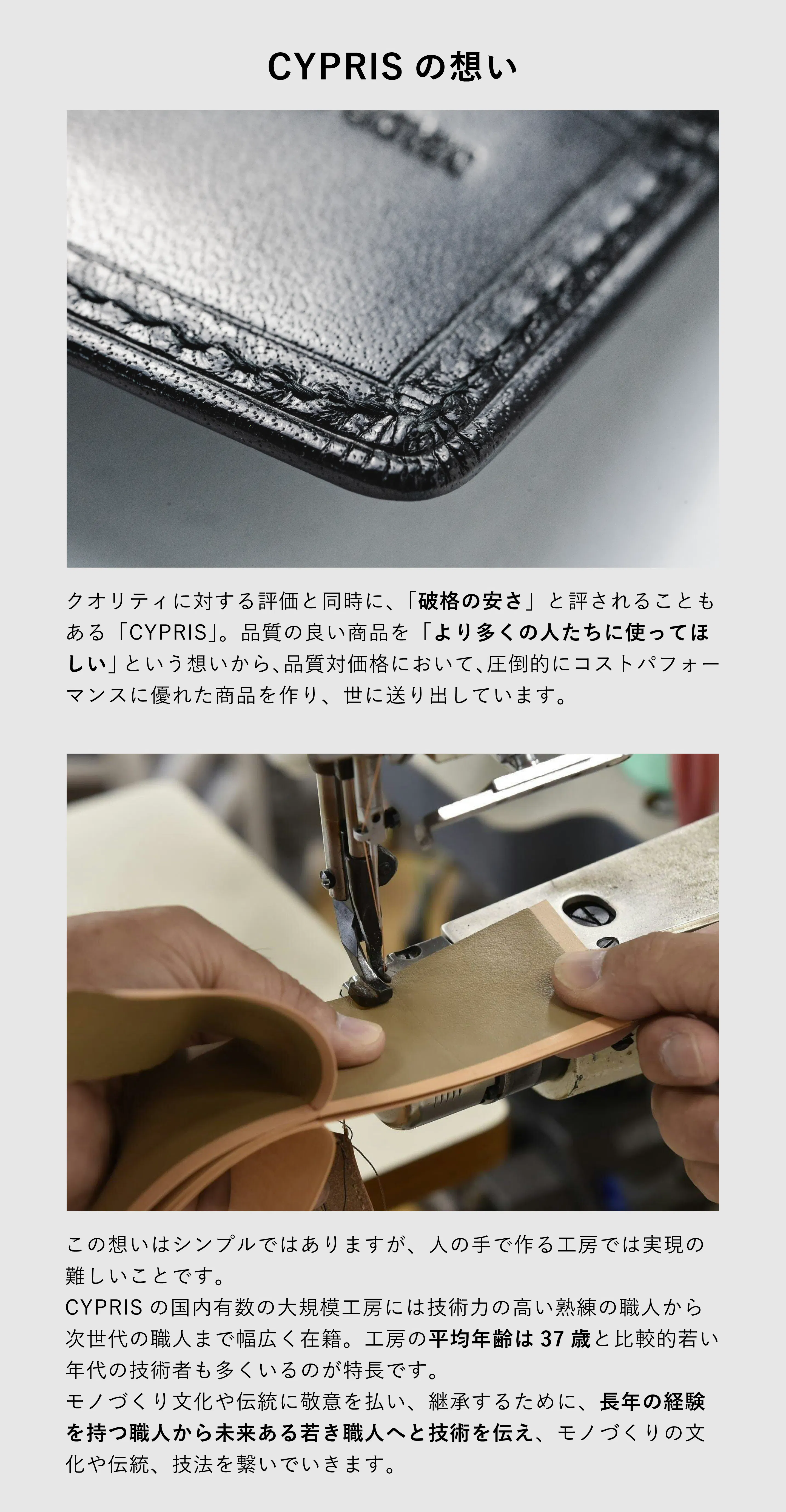 「CYPRIS」は1995年創業、株式会社モルフォが立ち上げた日本製レザーグッズブランド。「一生愛せる本質的価値のあるモノづくり」を基本理念に、厳選された素材を使い、機能美にこだわり、日本のクラフトマンシップが培ってきた卓越した技法を用いて様々な革製品を生み出しています。
