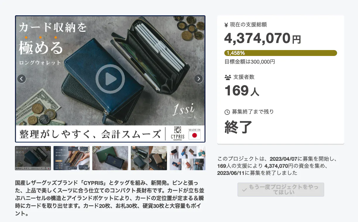 「matowa」と同じハニーセル®︎構造を採用した長財布「1ssi」のクラウドファンディングでは、400万円以上のご支援をいただきました。