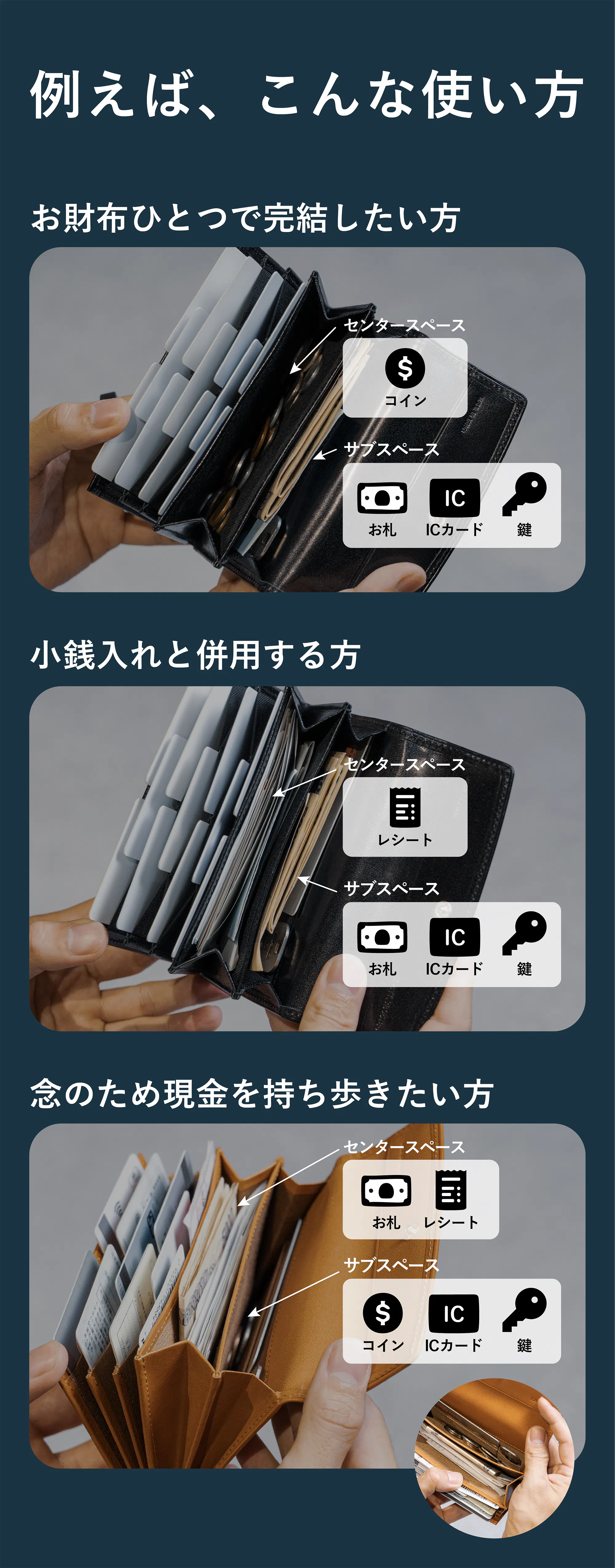 カード以外は収納場所を定めていないのが「matowa」のもう一つの特徴。センタースペースとサブスペース、小さなポケットなどをうまく活用しながら、ご自身の使いやすいスタイルでお使いいただけます。