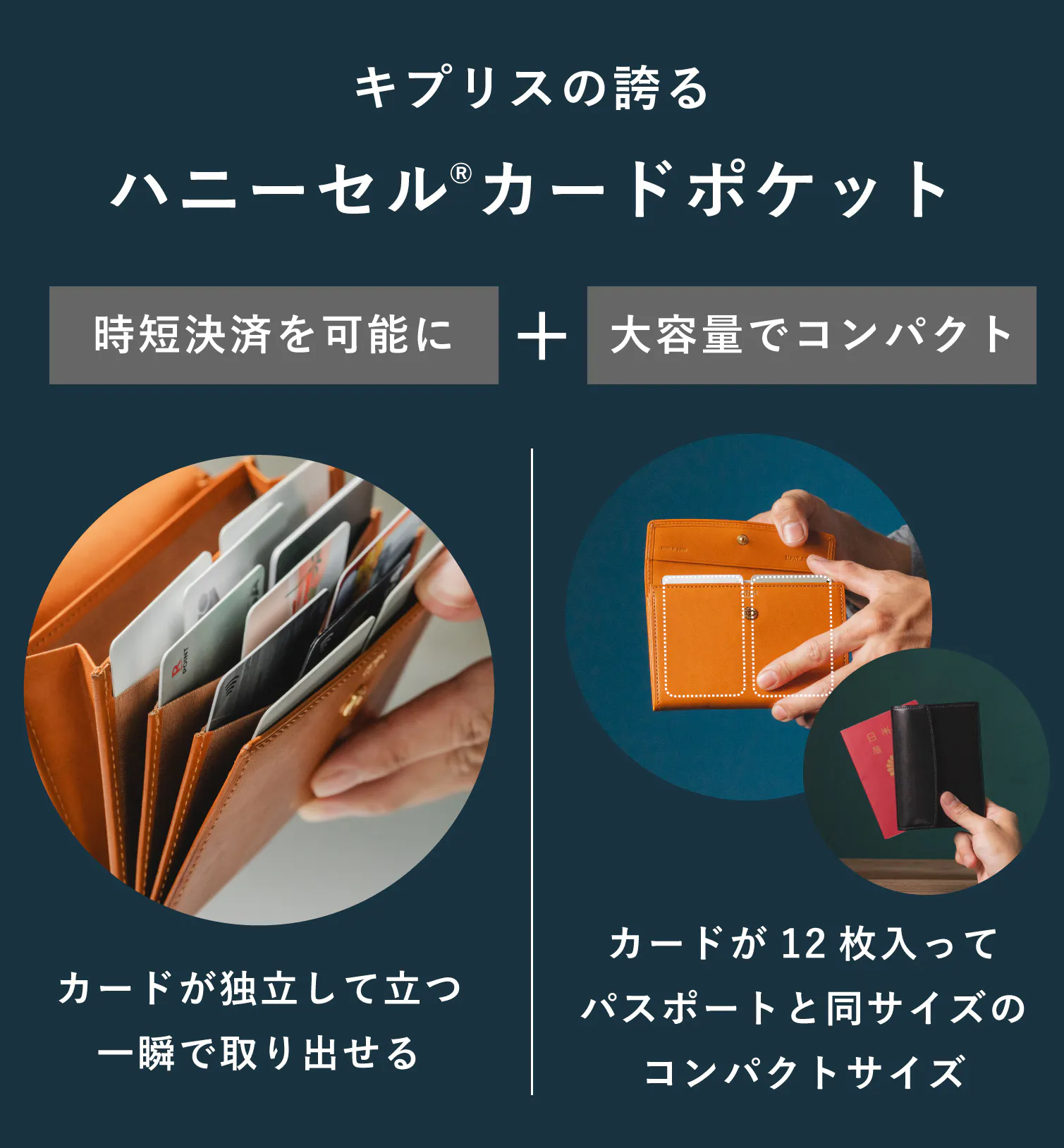 また、技術の結晶であるハニーセル®︎構造はカードが取り出しやすいだけでなく、カード収納をコンパクトに設計できるという強みも。