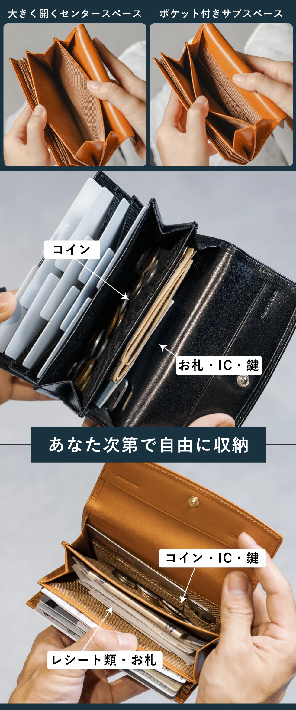 ライフスタイルの移り変わりに合わせても使いやすく、中身を入れ替えながら長く使って欲しい。そんな思いを込めたお財布です。