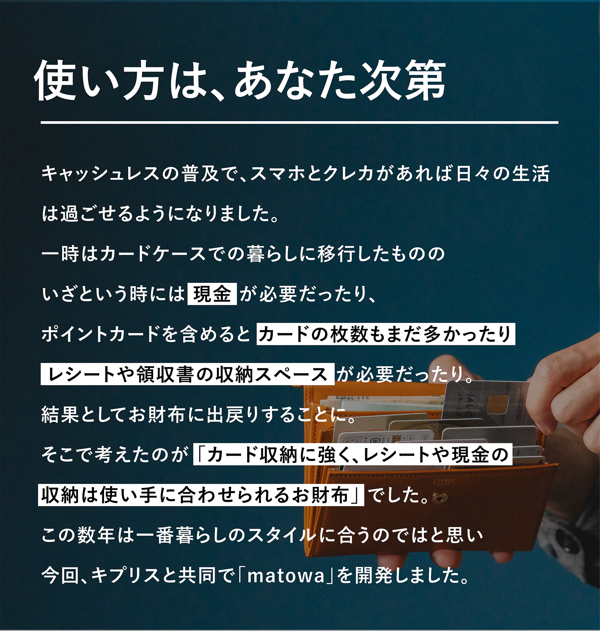 「matowa」は多様化する現代のライフスタイルに合う、理想的なウォレットです。